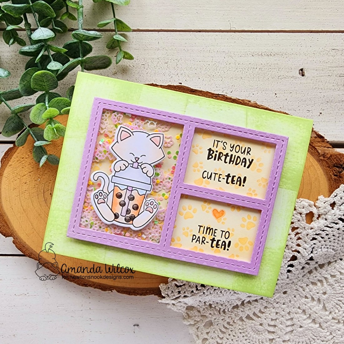 First up, a shaker card with Newton’s Bubble tea. I colored the images soft and sweet and kept the card colors in line with that. Using the new Frames & Tags dies to create a grid with one window as a shaker was fun and different for me. The shaker bits are from the Newton’s Nook birthday last year – Celebration Embellishment Mix.