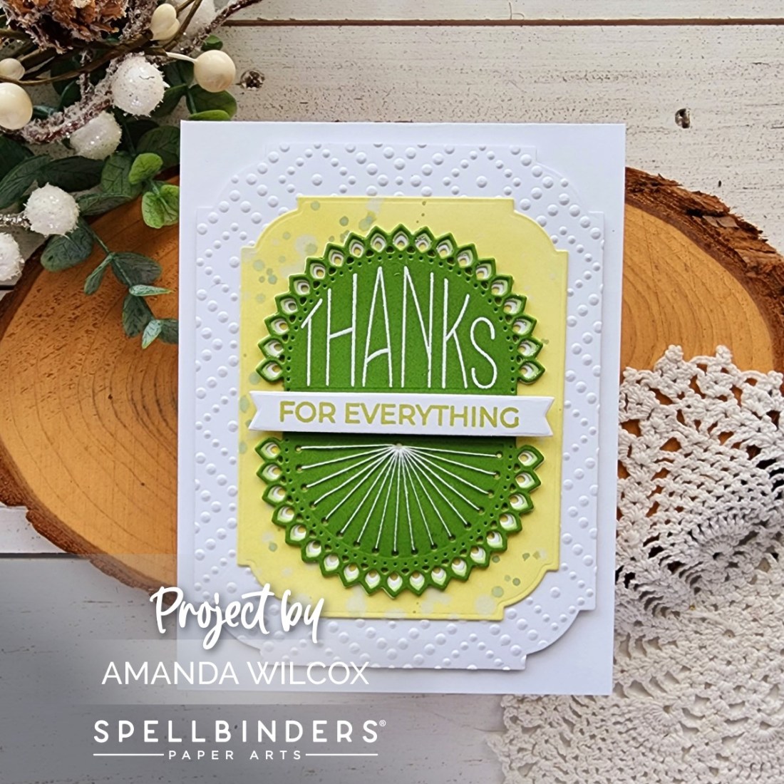 I used the Big Paw Prints stencil on a piece of green cardstock with darker green ink. Then I splattered the panel with a different, darker green and also white paint. After it dried I trimmed the panel down to 4×5.25 inches and popped it up on a white card base.