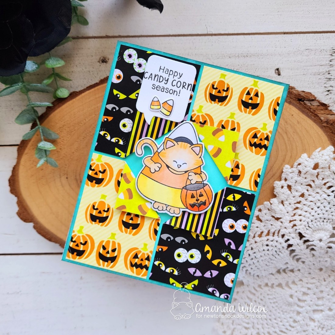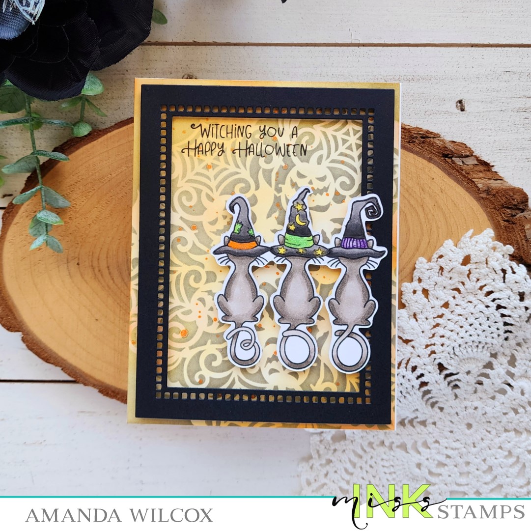I took a piece of white cardstock smaller than my kraft panel and inked it with ripe persimmon and spiced marmalade distress oxide ink. I splattered it with water and blotted it dry. Then I sprinkled some matte gold and espresso confetti bits on the panel and sealed them up with the pumpkin window panel.