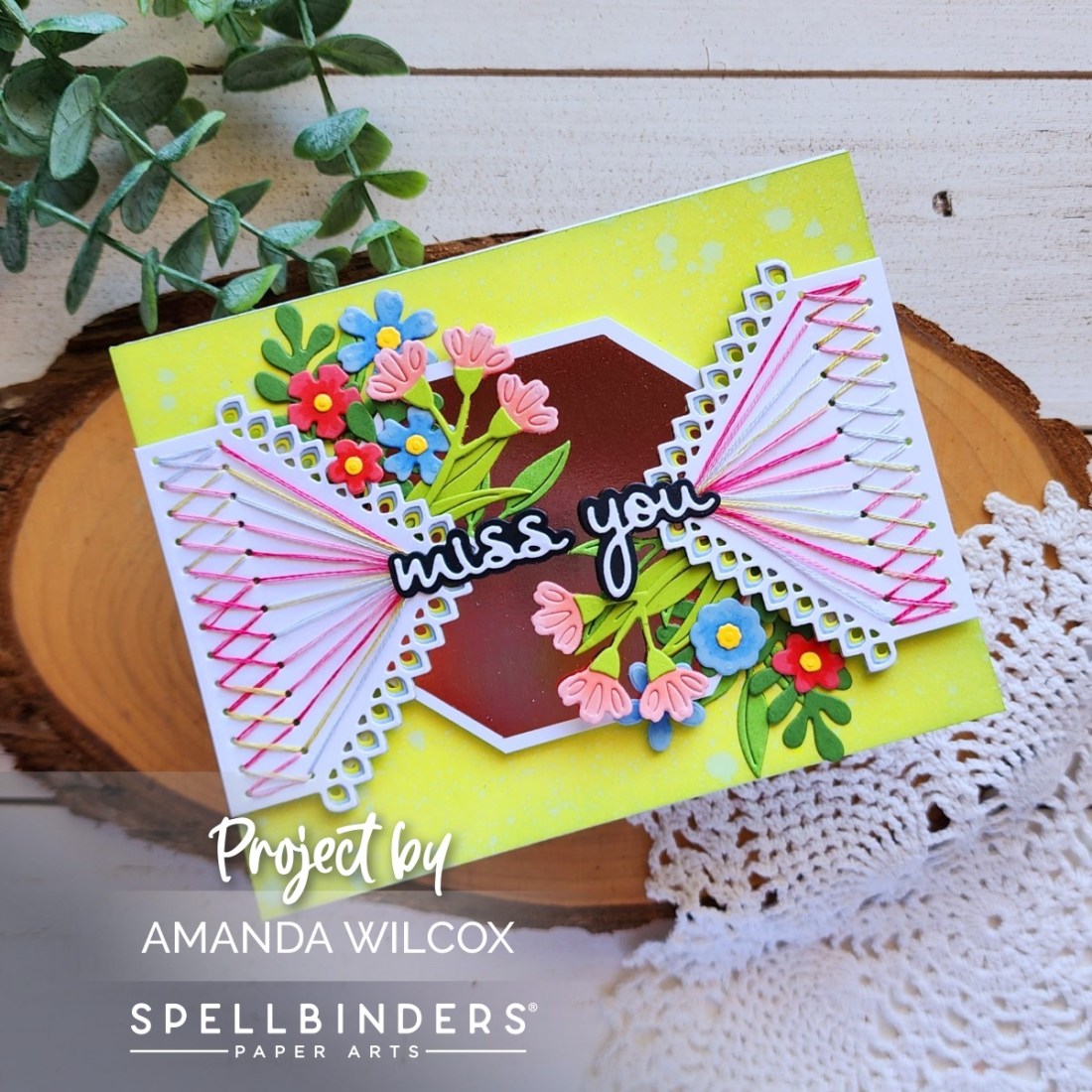 Next, I cut some grass using gingham paper in the Spring Blooms paper pad and a fence using the Fence die. I adhered the layers together with liquid glue and used the largest Framework die to cut it all out. Last, I stamped my sentiment in the bottom corner and popped the whole thing up on a white card base with foam tape.