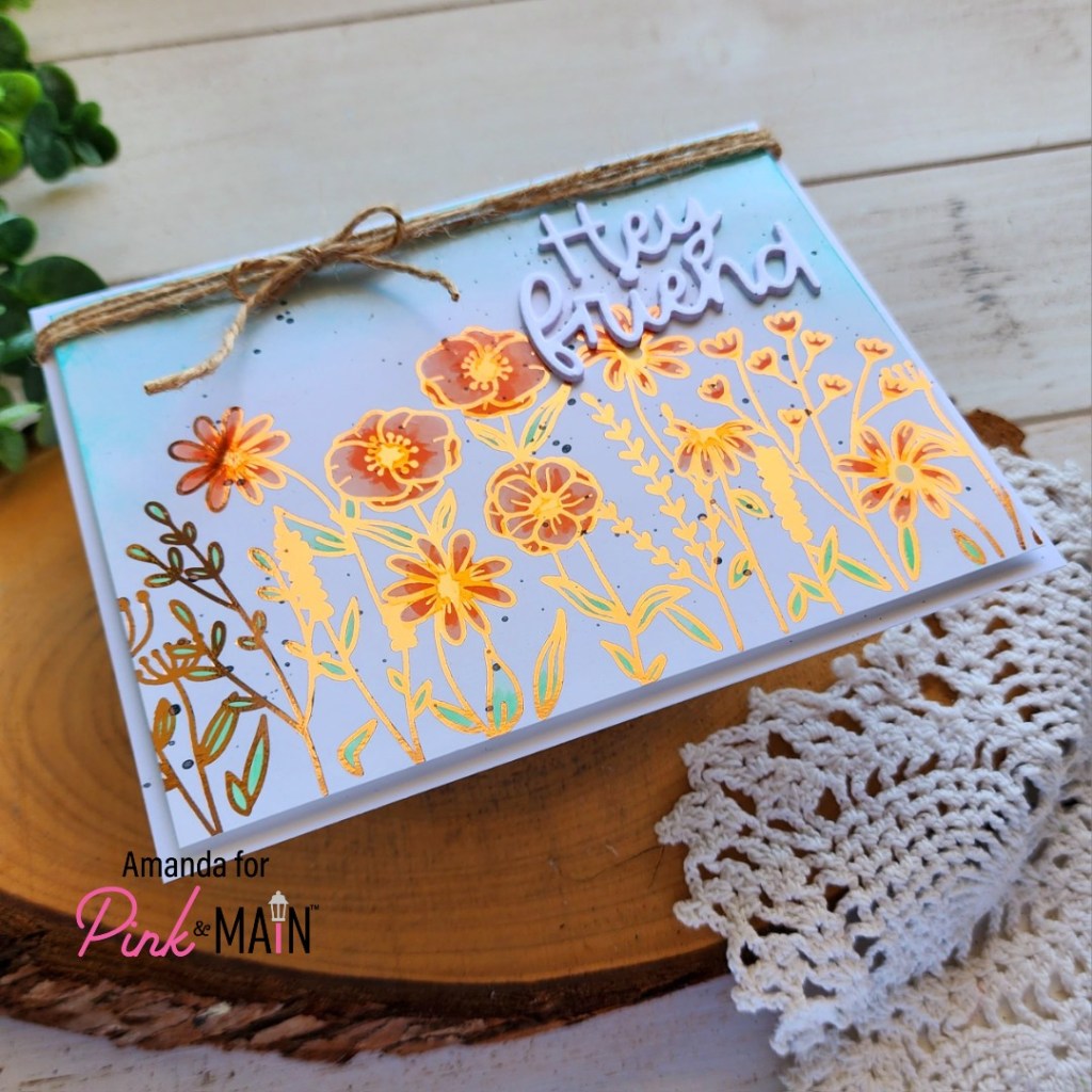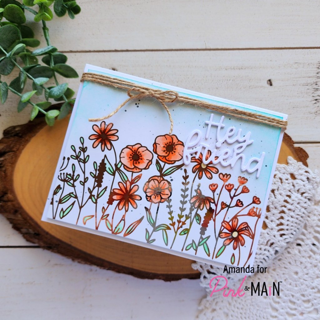 For the background I inked a panel with light yellow ink, then placed the Raindrops stencil over top and used a blending brush with light pink ink for those. I cut a scrap of cardstock with the Land Borders die and inked it with green, then layered the grass stencil over top and added a layer of grass in the front to.