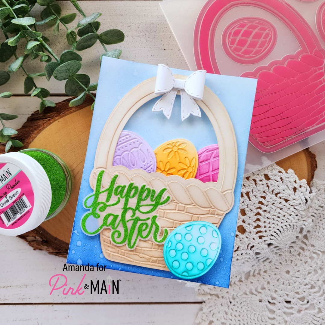 Today I have a card using the new Easter Basket cut & emboss folder. These are such a cool and innovative idea. You get that fantastic embossing and it die cuts the images for you at the same time! I cut these from white cardstock and then used all my Pink & Main dye inks to give them color with a blending brush.
