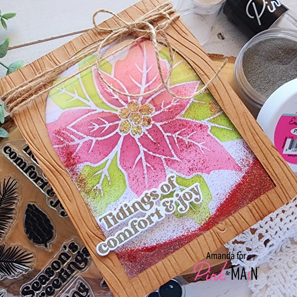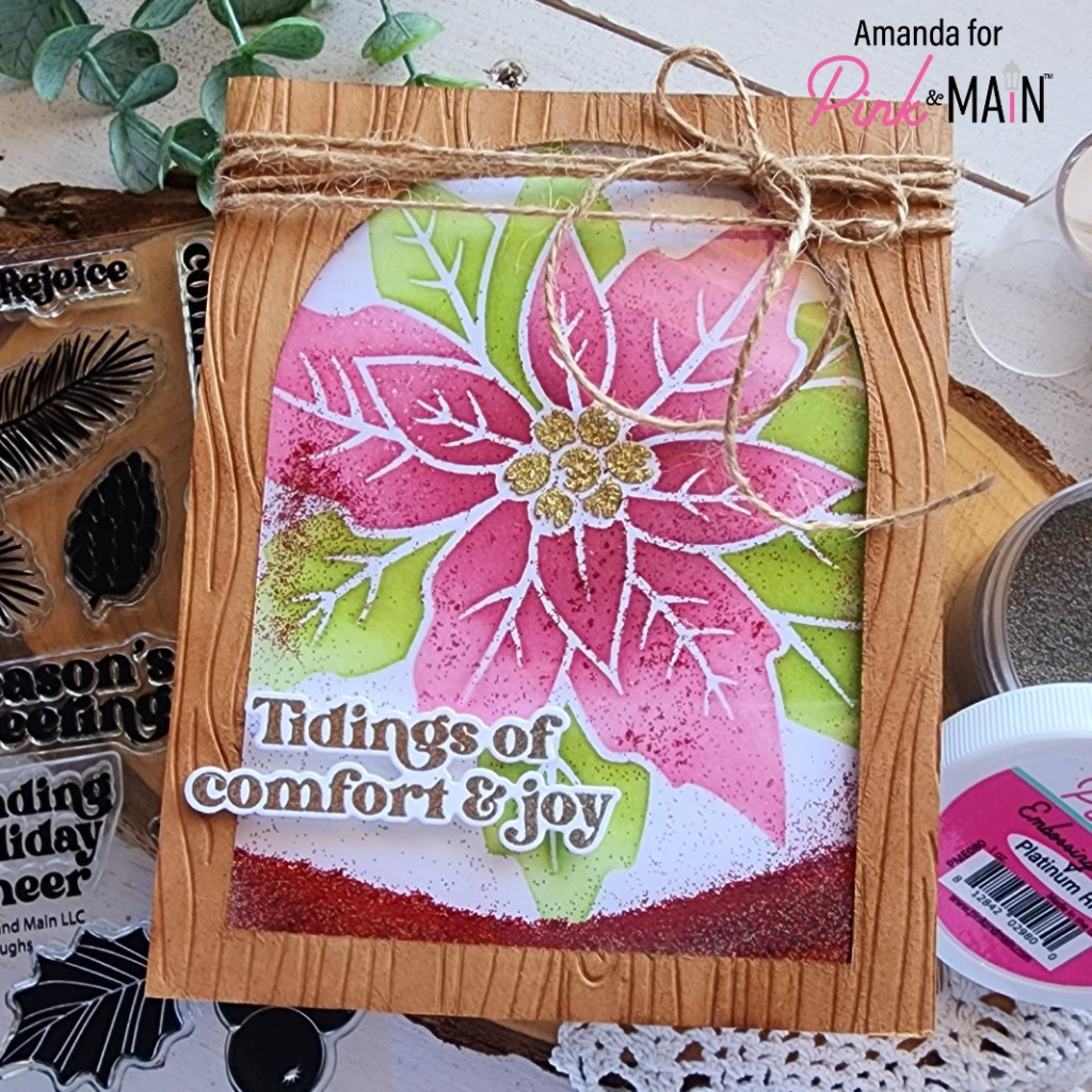 Happy Wednesday everyone! It’s time for some Pink & Main inspiration using the recently released Poinsettia stencil. This single stencil has all of the layers to create a gorgeously inked poinsettia flower that covers your card front. It’s so beautiful! Today I turned my inked panel into a shaker card for added fun.