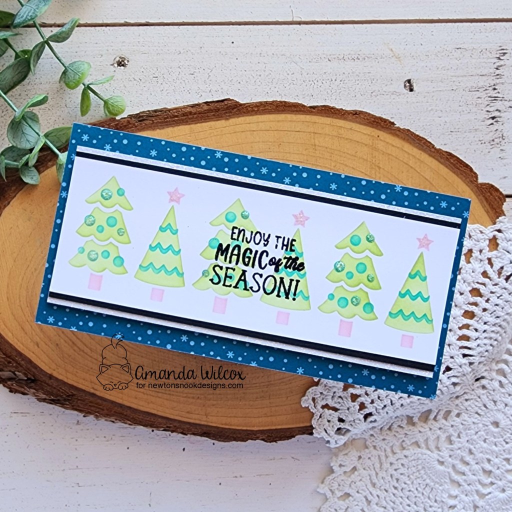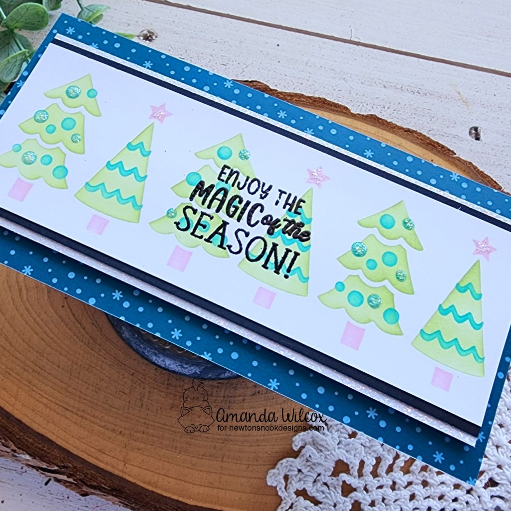 I stamped and heat embossed a sentiment coming later in the week in the center before popping it up on a 3×6 piece of paper from the new Christmas Time paper pad. I adhered that to a white card base with liquid glue and finished the design off with some stardust Stickles on various parts of each tree.