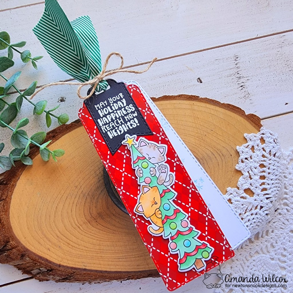 Next, I die cut another bookmark from white cardstock and used the snowflakes in the set to decorate it lightly so you can still write on it and see the writing. I tied the two together with ribbon and just added some glossy accents to the ornaments and kitty noses and toe beans to finish it off.