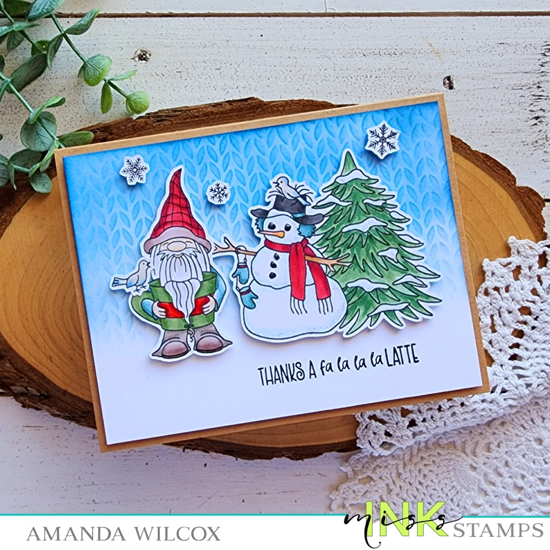 For this challenge, every month you have to create cards with coffee, Christmas and one other element. This month is gnomes! So I had a little fun mixing and matching different sets to create a little scene and a super fun sentiment!