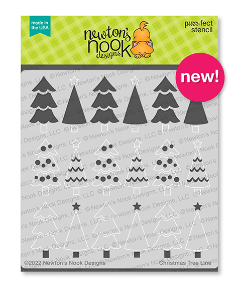 These super fun line stencils are getting me every time. They are so fun to play with and today I created a perfect mini slimline card with the new Christmas Tree Line stencil. I went with a non-traditional color palette of green, pink and teal, trimmed the panel down and adhered borders on the top and bottom of black and glitter cardstock.