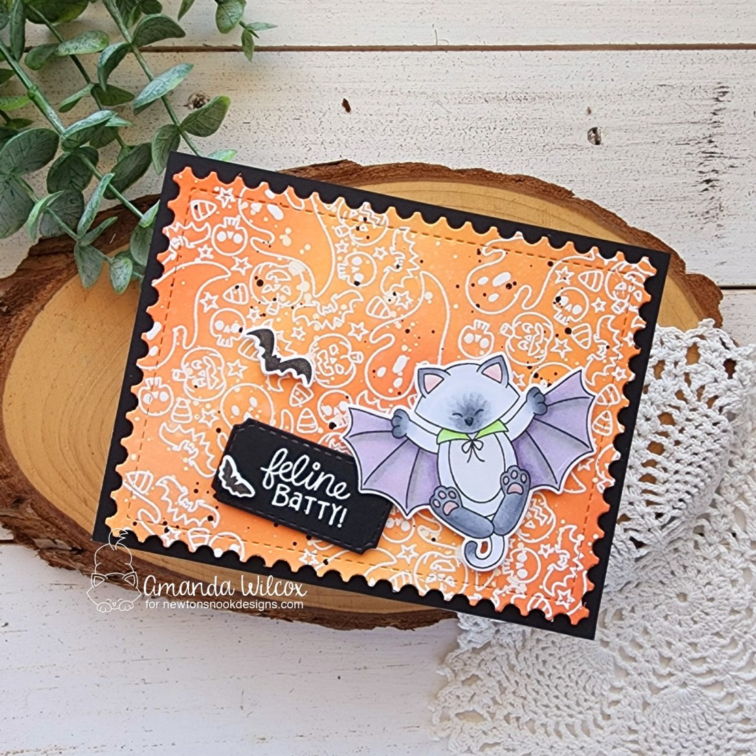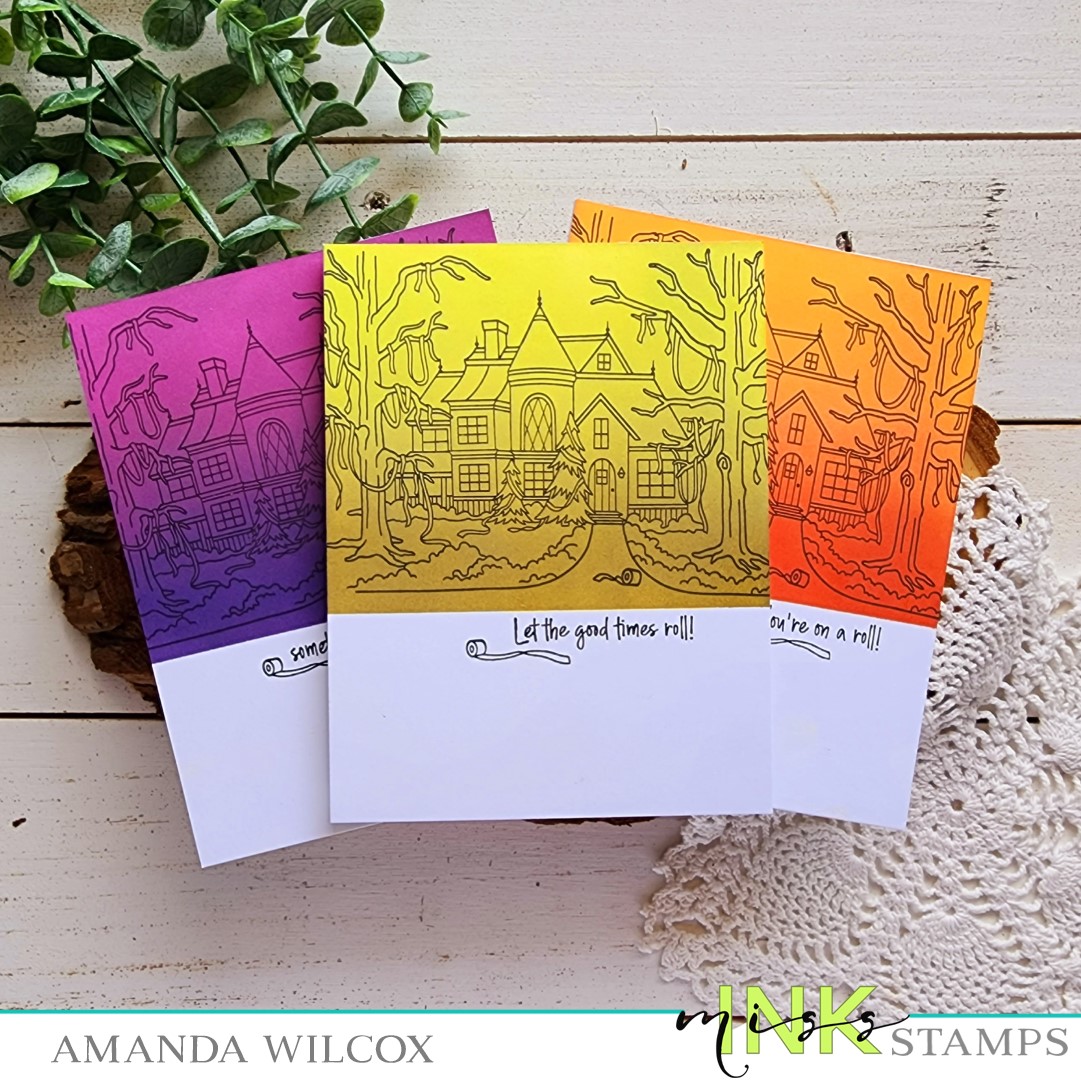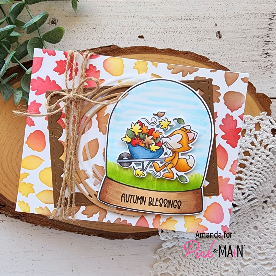 I started by stamping and coloring images from Mouse Friends and Fall Envelopes and colored everything with my copic markers. I used the coordinating dies to cut them all out and started working on my design. First I thought I would scatter the small images all over the background that wasn’t working so I created a blended panel with distress oxides instead.