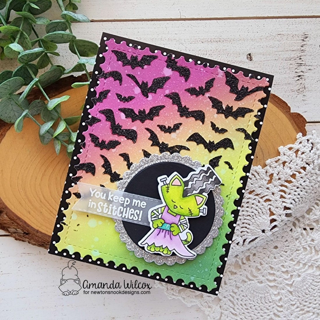 Next, I used Circle Frames dies to cut a silver scalloped and regular black circle to add my image and sentiment to. Then I switched gears to my background. For that, I ink blended distress oxide ink in mowed lawn, twisted citron and seedless preserves at an angle. Then I spritzed the panel with water and used the Bats stencil to spread glitz glitter gel through. I intentionally did this at an angle like the inking and faded imperfectly as I went down.