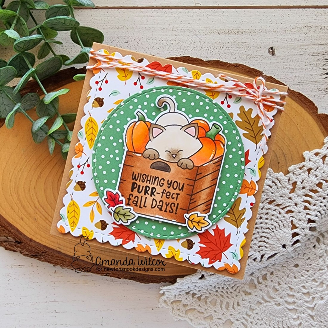 The scalloped square, circle and Newton are all added with foam tape, along with the accent leaves too. Then I finished the design off with orange twine I saved from older Newton’s Nook packages.