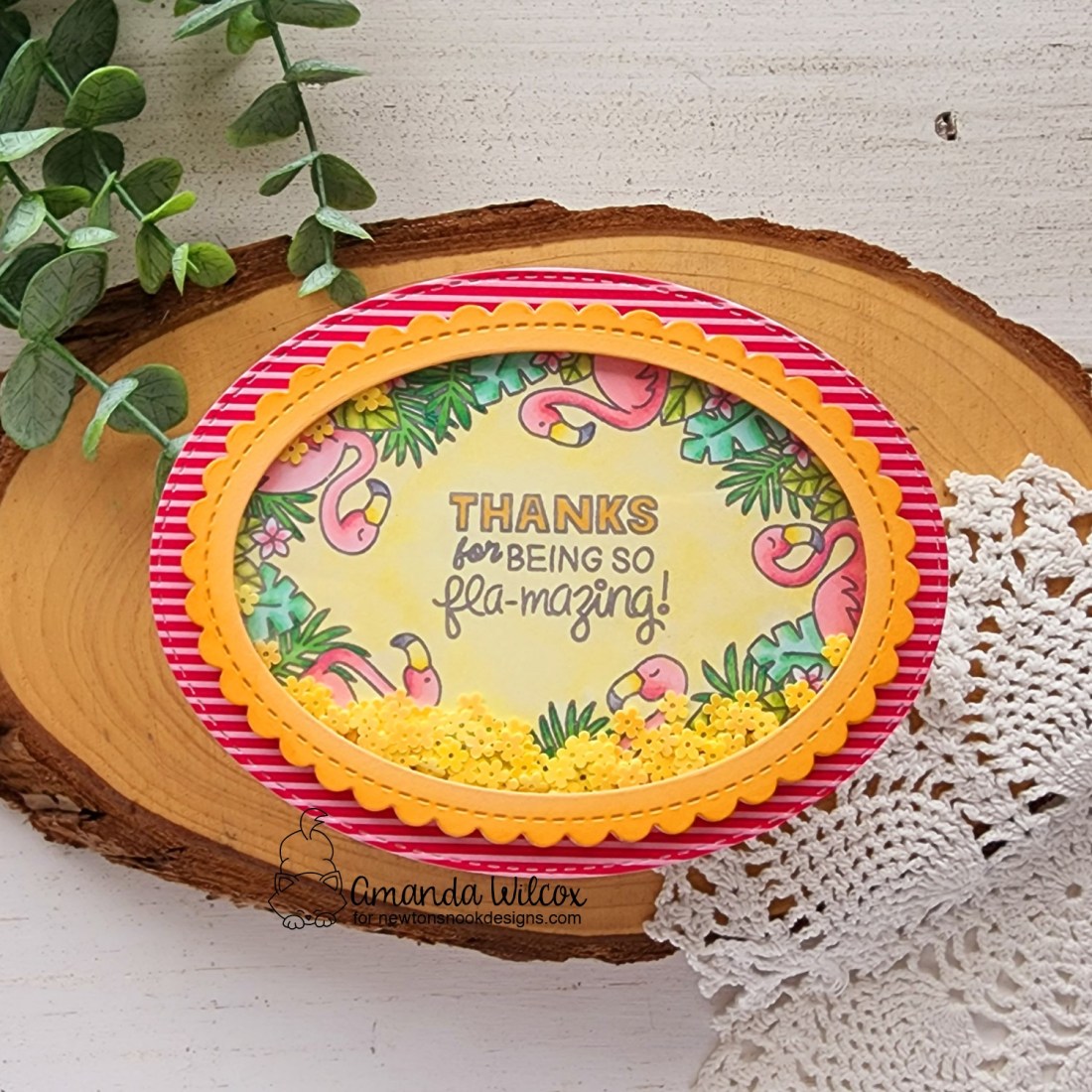 Once the panel was foiled, I wanted it to have more texture and dimension so I inked up the edges with brown dye ink and splattered some of the same ink across it too. A little note, if you foil, you you can blot splatters off the foiling, but if you flock it will soak in. Just keep that in mind when you’re crafting.