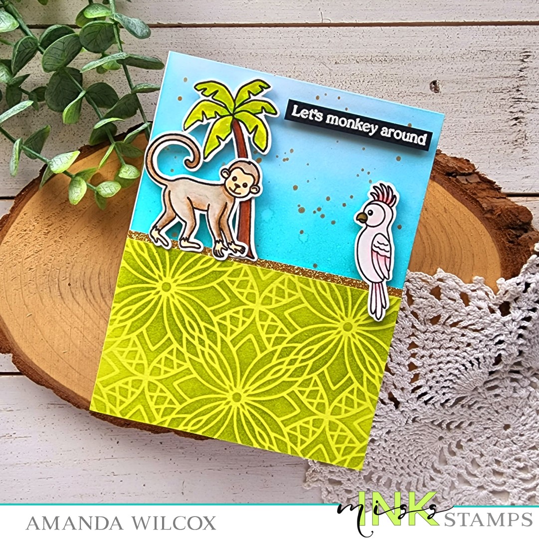 For this card, I colored the images in the set and used the coordinating dies to cut them out. Then I set them aside to work on my background…aka, making a fabulous crafty mess. I inked up a panel with distress oxide ink in salty ocean and tumbled glass. Then spritzed it with water and flicked watered down salty ocean ink on the panel. Once it was dry, I spread Thermoweb transfer gel blanco through the Cloudy Sky stencil and let it dry.