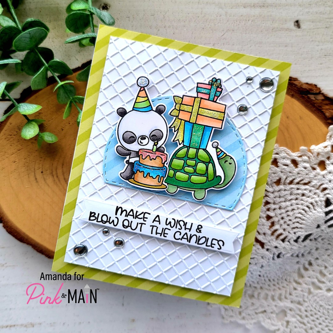 But this is a birthday card, so I couldn’t leave these cute images alone! I added glossy accents to the turtle’s shell and panda’s nose. Then I went nuts with the unicorn stickles on the hats, cake and gifts! I think it adds so much and makes this such a happy and fun card!