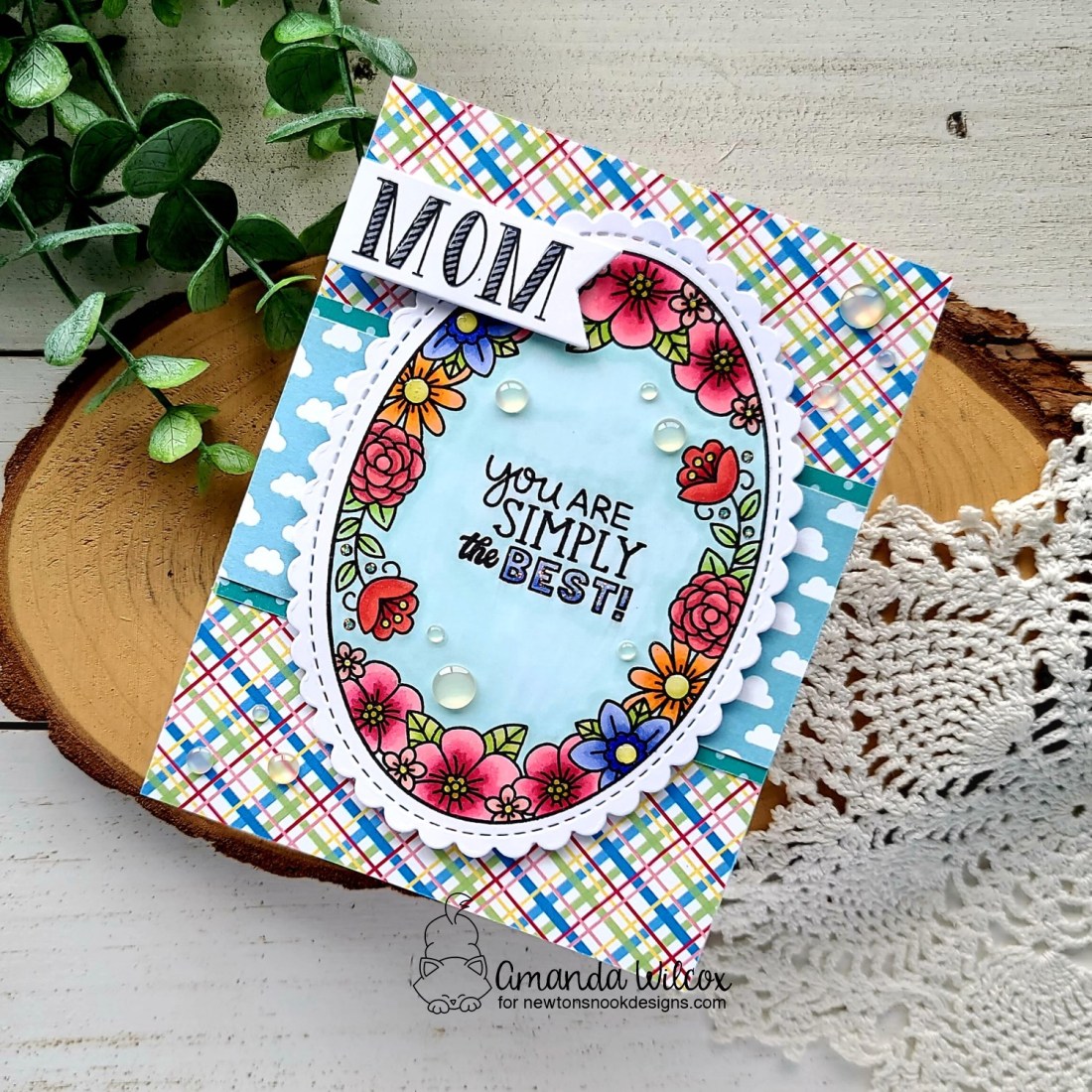I trimmed the plaid paper to A2 size and adhered it to a white card base. Then I cut a strip of the fun cloud paper and edged it with the teal polka dot print before adhering it next. Then I popped the oval up with foam tape. To round out the design I thought it would be fun to add the “MOM” to a banner and pop it up too. This banner came from the Frames & Flags die set.