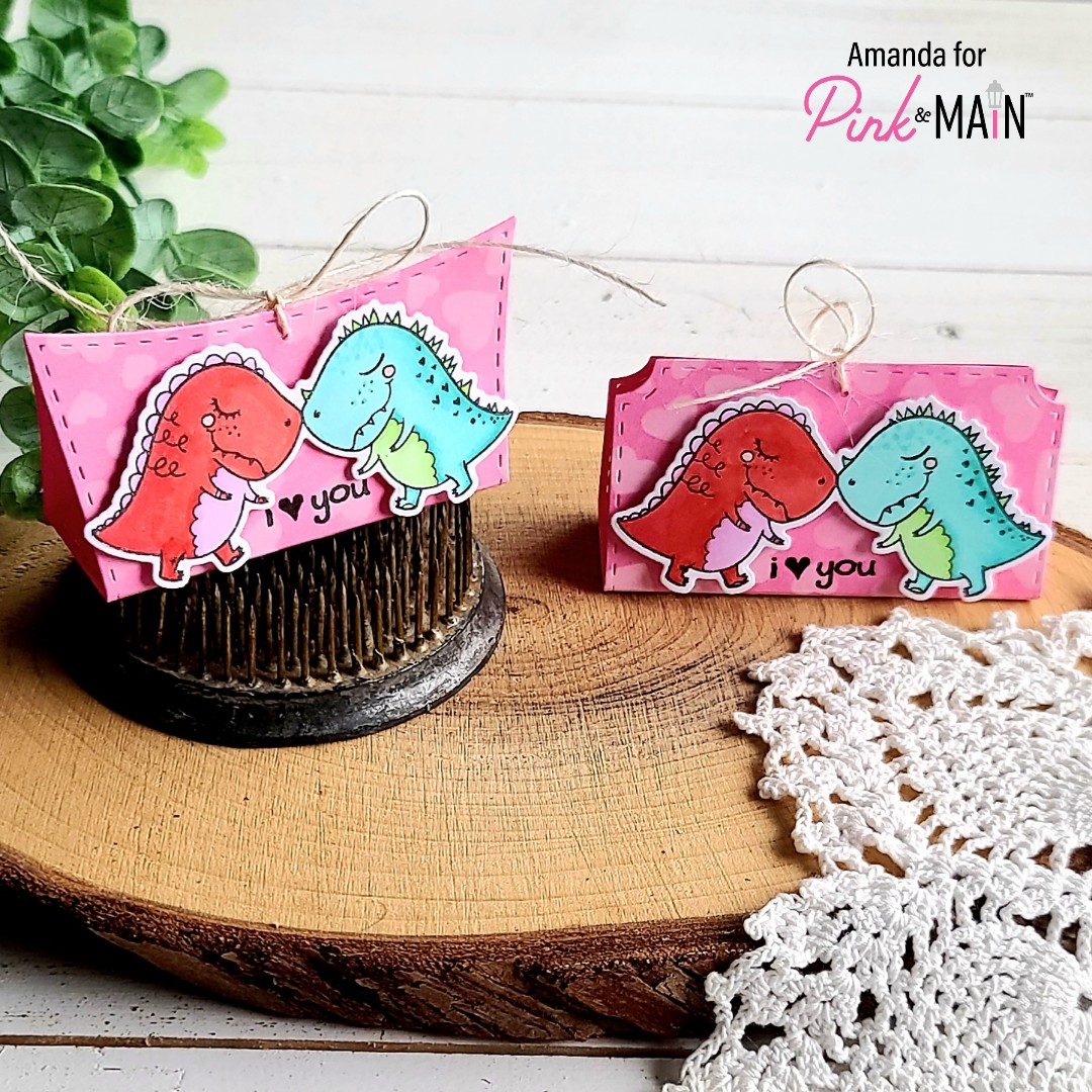 For my treat holders today, I cut one of each of the shapes I showed above from pink cardstock and inked it up with the scattered hearts stencil and white pigment ink using my ergonomic blending brush. Then I scored them both and folded them up. I stamped and colored this fun image from Rawr with my copic markers twice before cutting it out with the coordinating dies.