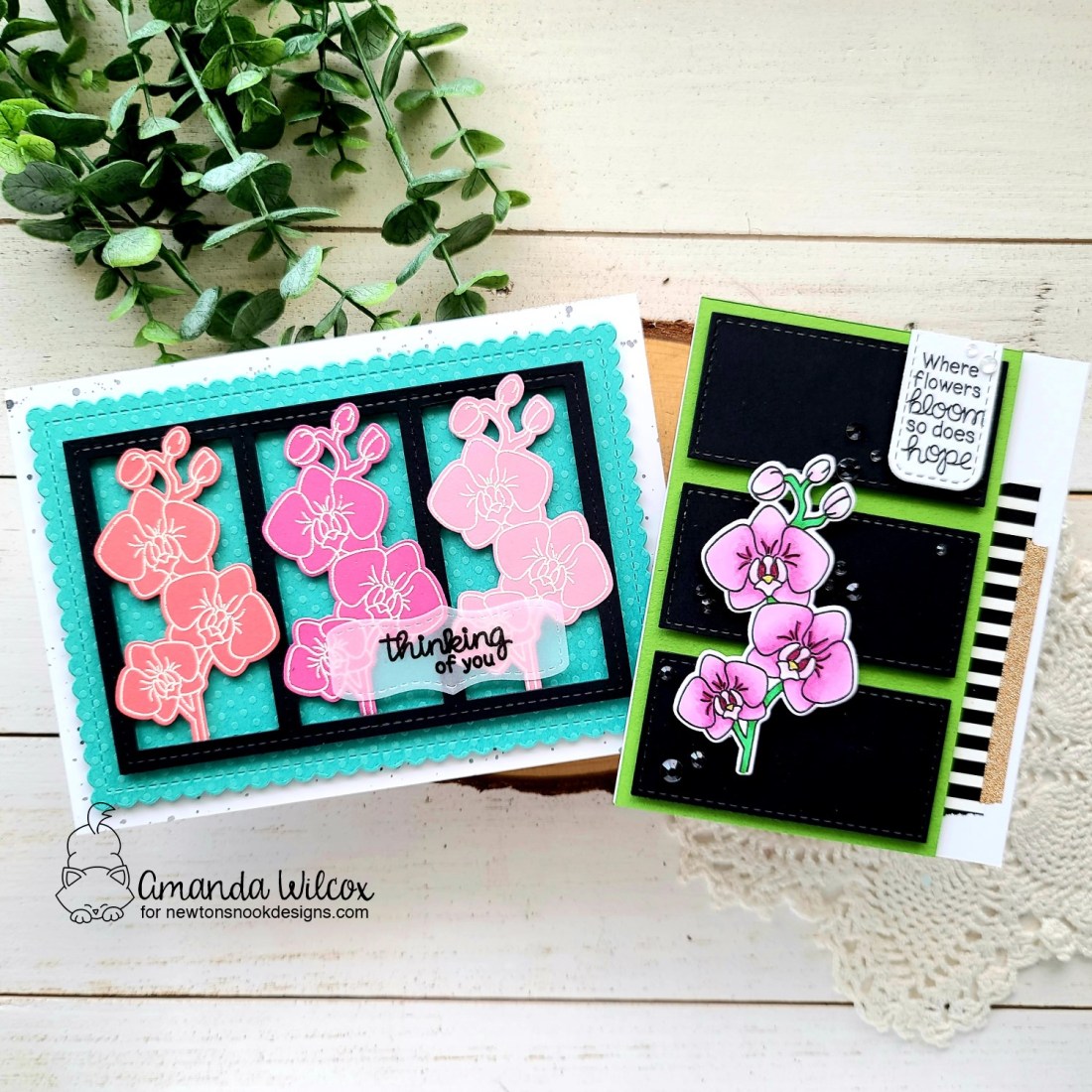 To assemble, I cut a piece of green cardstock and popped the black rectangles up with foam tape, then I adhered the orchids and sentiment banner with foam squares before popping this whole panel up with foam tape on a white card base.