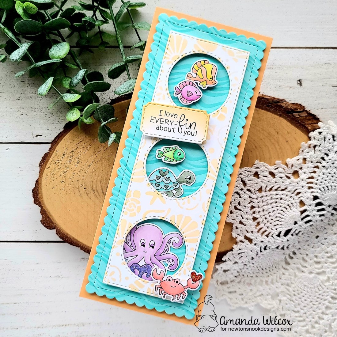 I didn’t want a white border so I cut a piece of orange cardstock close to the ink color of the seashells and adhered it to a white slimline card base. I popped the waves panel up with foam tape and then popped the seashell panel up on that. I added the images with a combination of foam squares and liquid glue for dimension and interest, finishing things off with the sentiment in between the top and middle portholes.