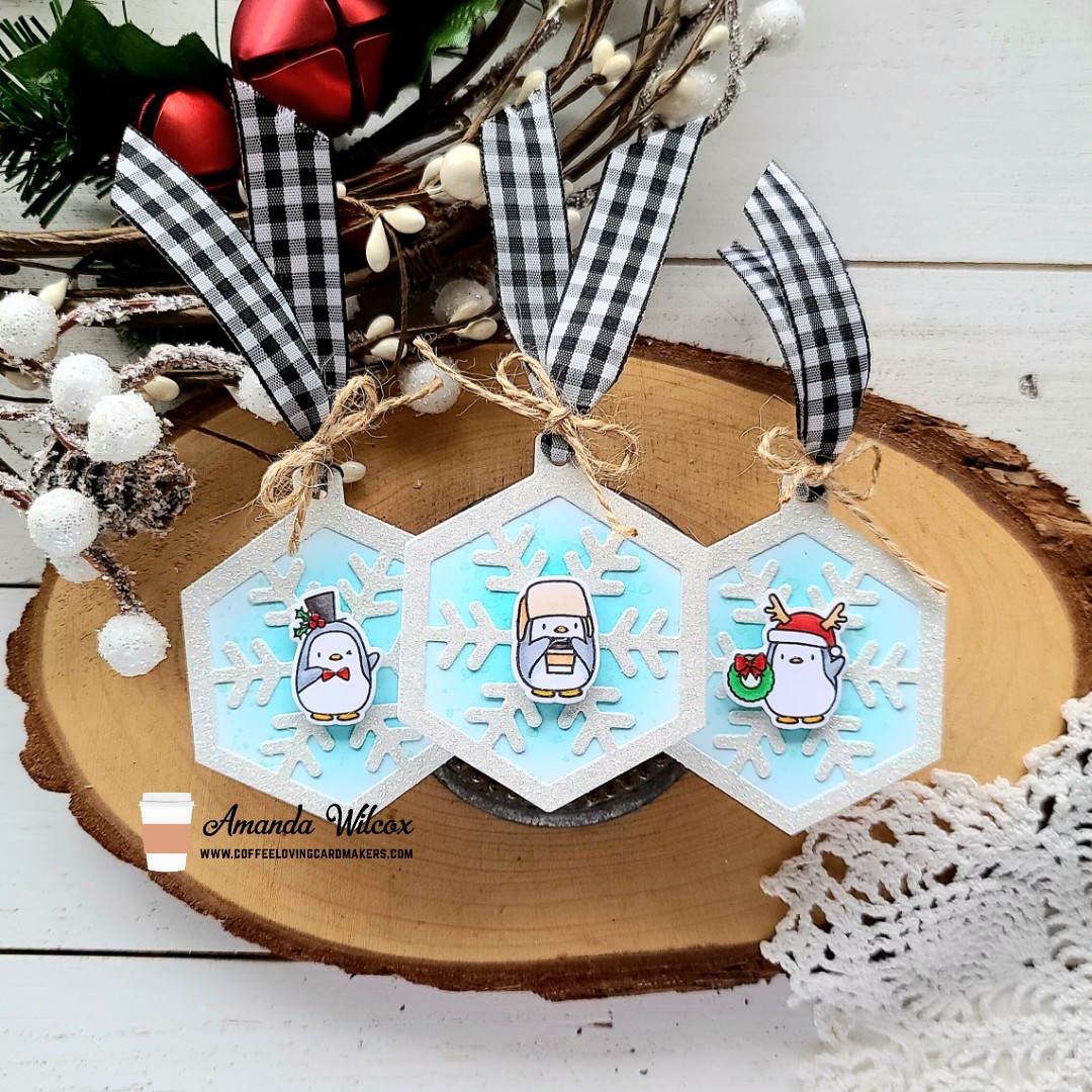 Then I chose 3 penguins from the Little Agenda Penguin stamp set and colored them with my copic markers. I used the coordinating dies to cut them out and popped them in the center of each snowflake with foam squares. Next, I threaded black gingham ribbon through the tag hole and tied it with twine.