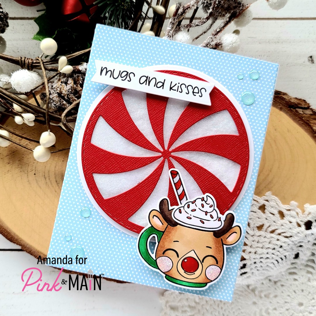 For my background, I chose a fun light blue patterned paper in the Best Friends paper pad and cut it out with the largest rectangle stack A2 dies and adhered it to a white card base. Next, I added the peppermint shaker and finally added the sentiment strip and reindeer mug with foam squares.