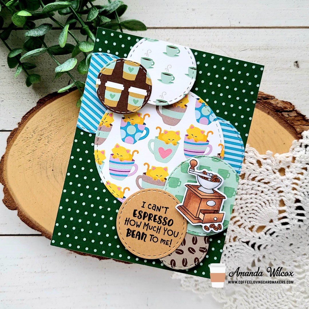 I chose an array of papers and grabbed the circle frames dies and the frames squared dies (for the circles in it, haha) and started cutting out different size circles. I also cut one from kraft cardstock and stamped a sentiment from Time for Coffee on it.