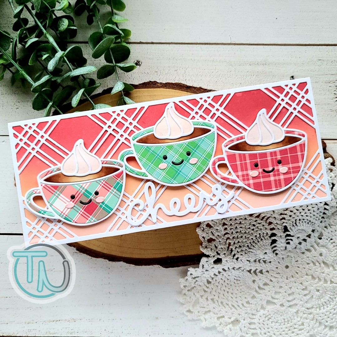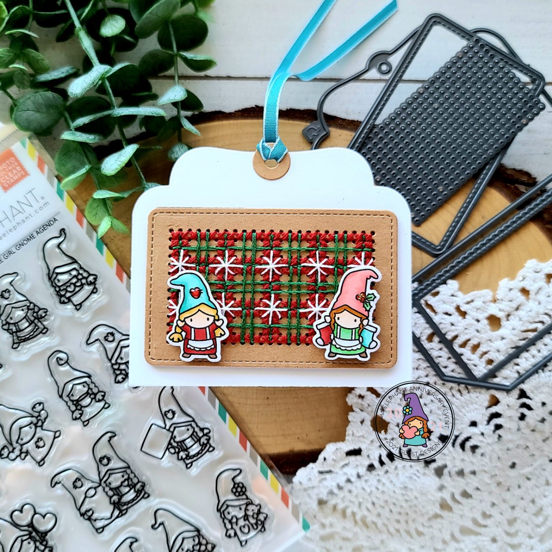 I used the Stylish Stockings die set and the new paper pad to create some fun red and green stockings for my background. After adding the stockings to a white panel I used the largest Frames & Flags die to cut the panel out. Next, I stamped and colored my image with copic markers. Once it was colored I stamped a sentiment from the set inside the stocking and used the coordinating die to cut it out.