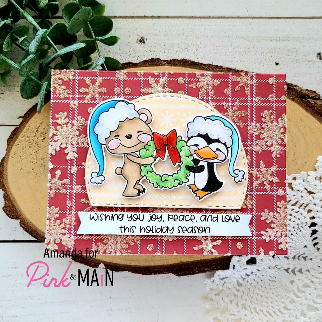 I stamped and colored the images with my copic markers, then used the coordinating dies to cut them out. For the background of my scene, I inked up the Evergreens stencil and die cut a couple of snow drifts using the Land Borders dies. Then I layered everything together and cut it out with the largest Framework die so the edges lined up correctly.