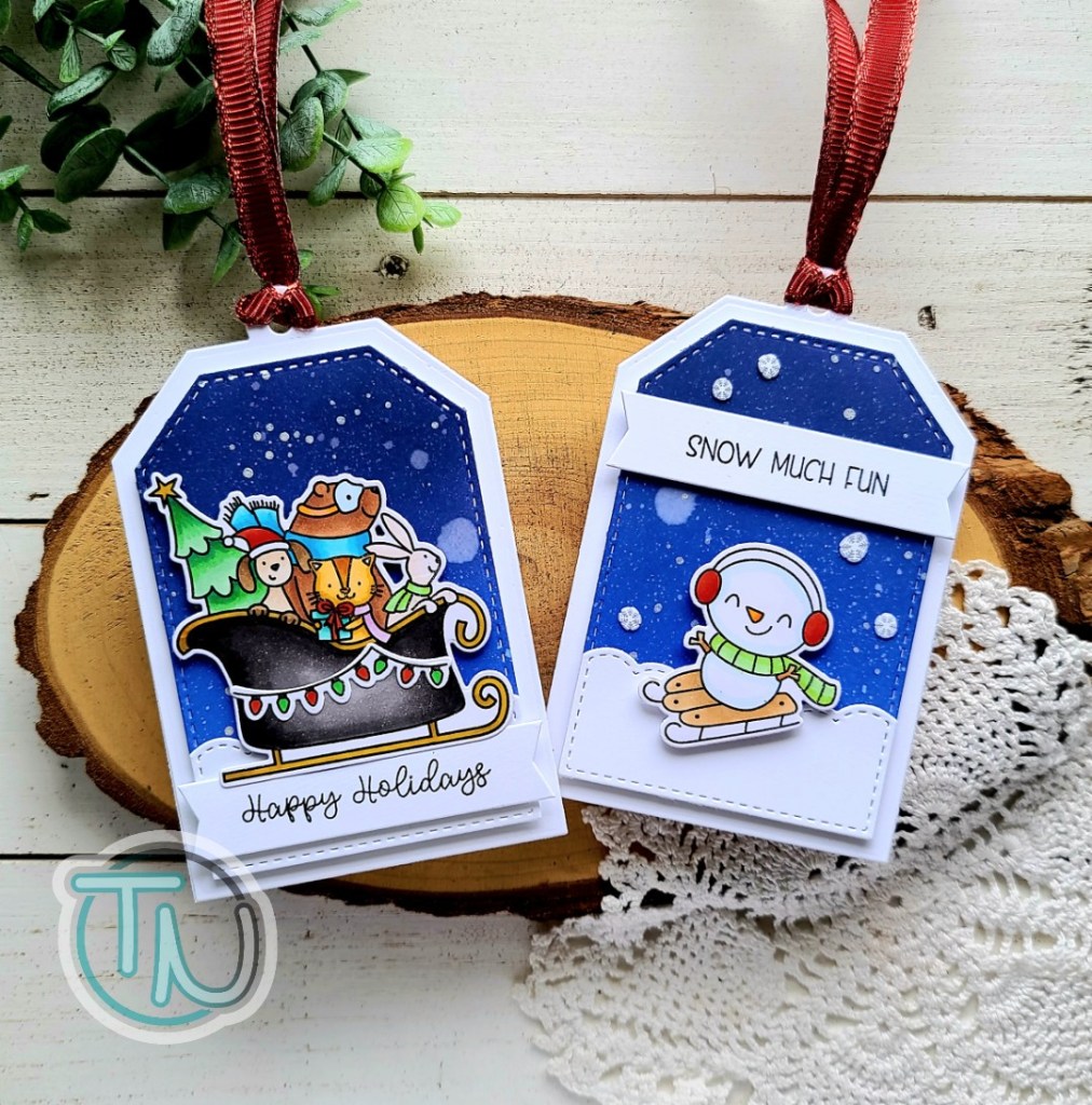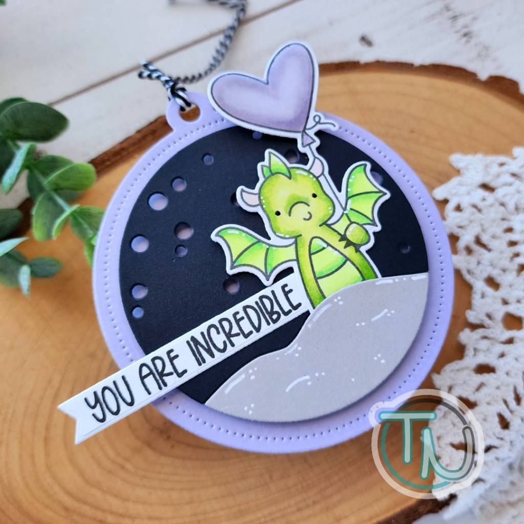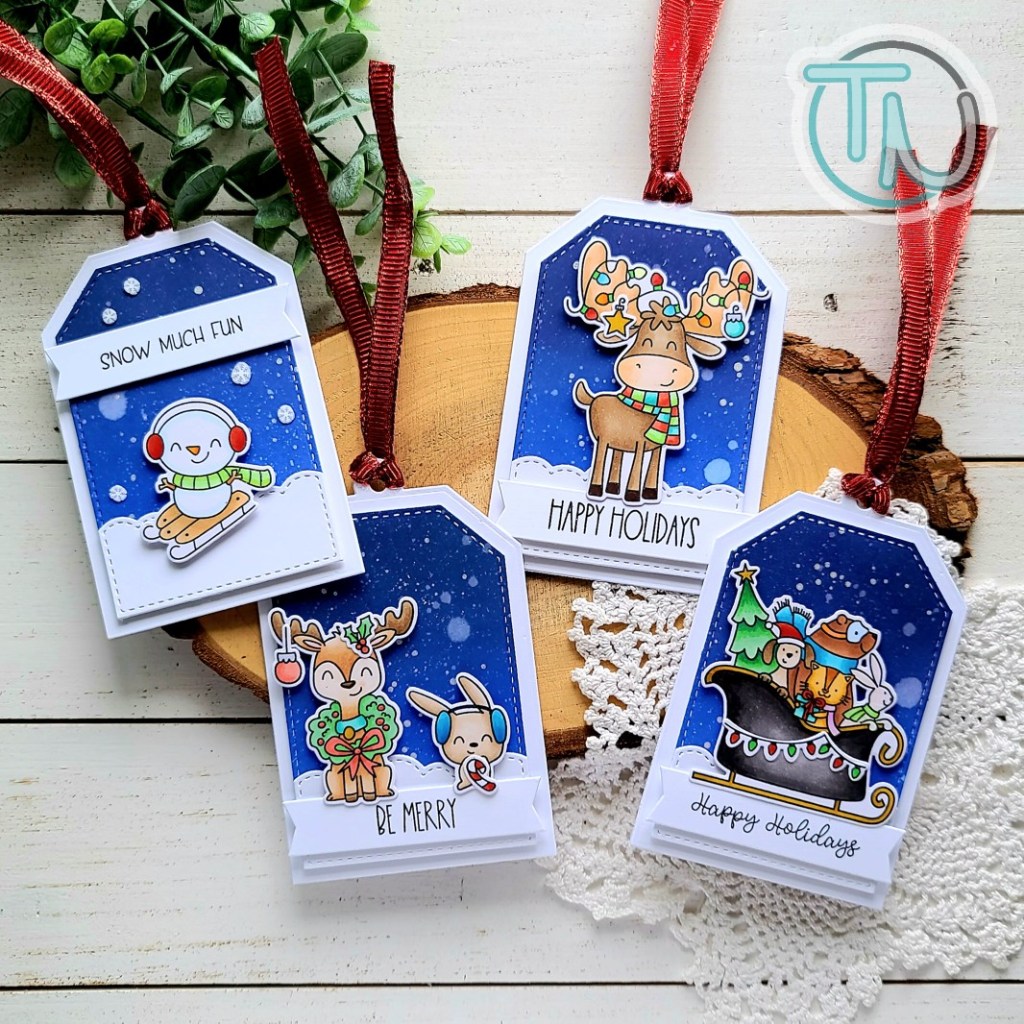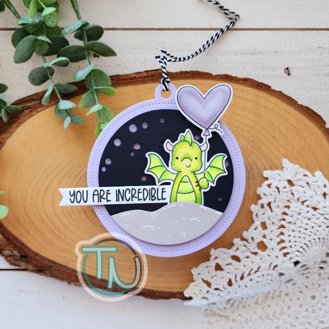I started by stamping and coloring the sweet image from Dragon Love with my copic markers. I used the coordinating dies to cut him out and set him aside. Then I cut the elements for my tag using the Snowy Tags dies.