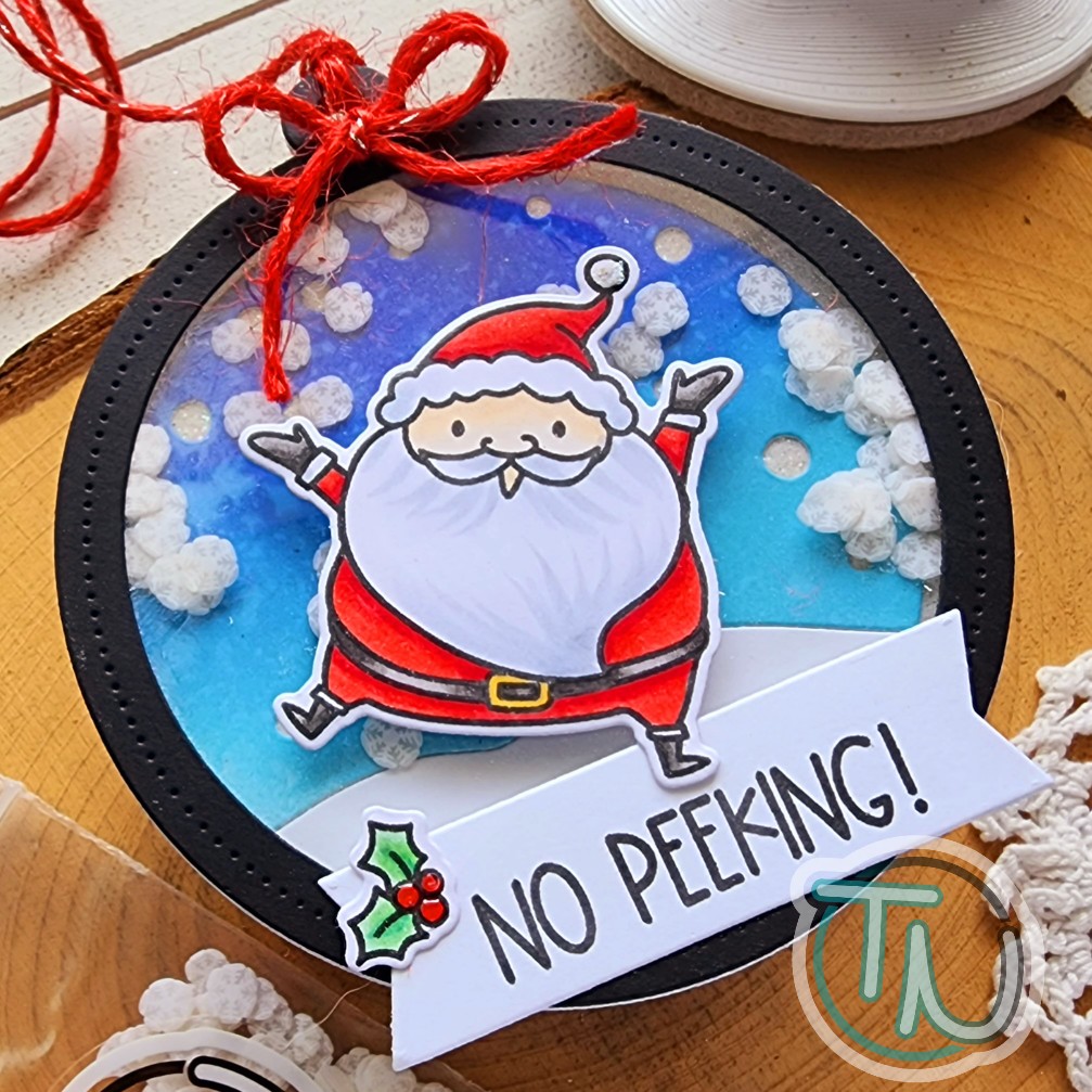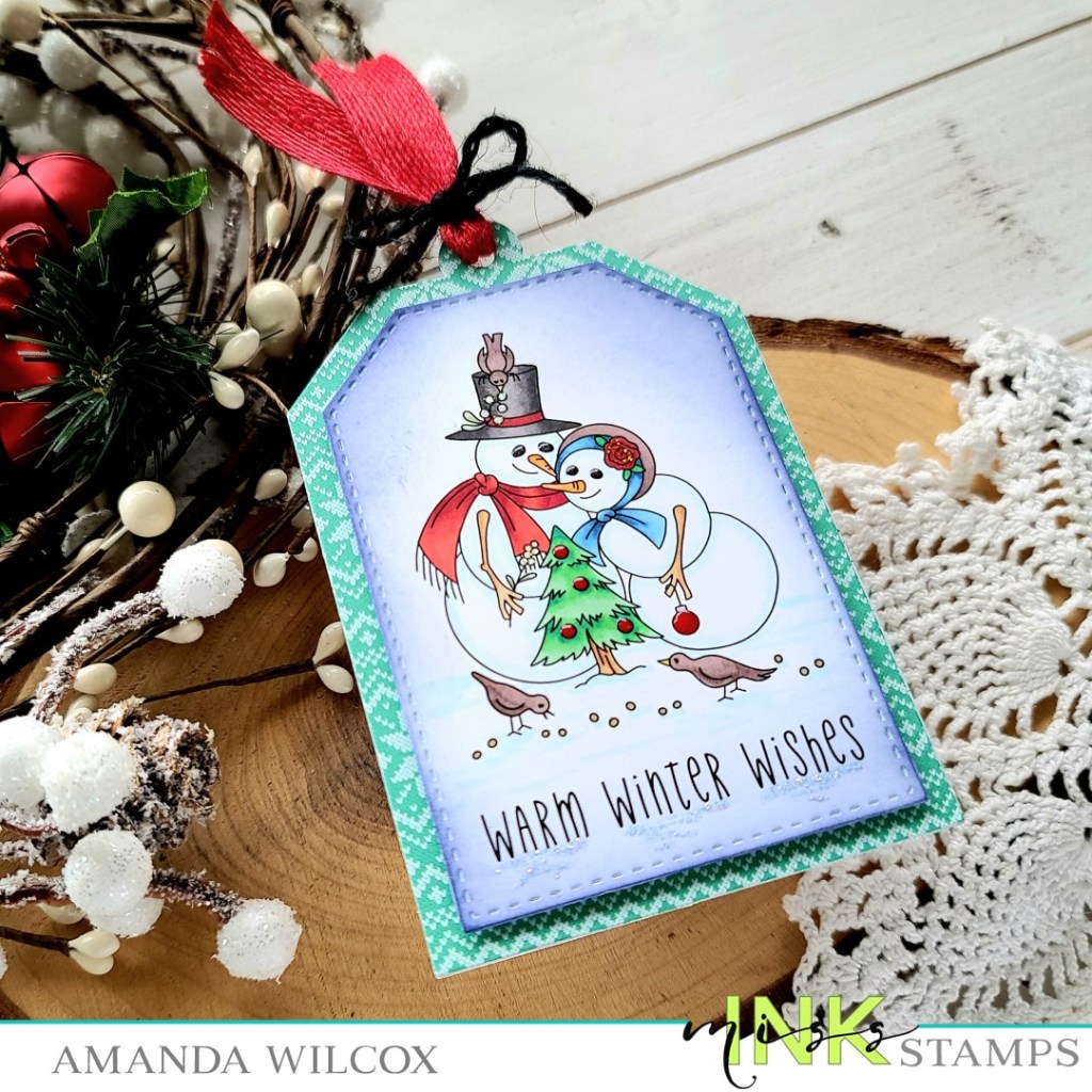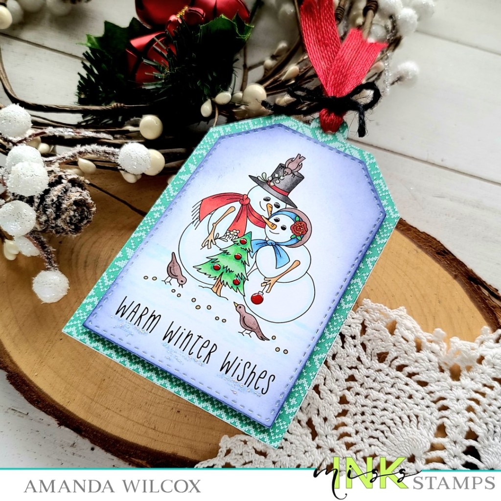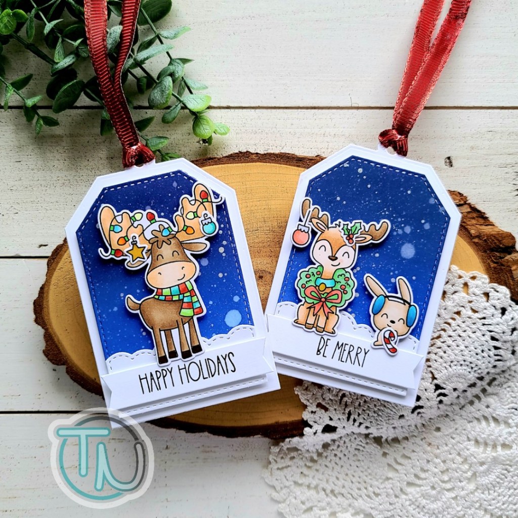 I started by stamping and coloring the sweet image from Dragon Love with my copic markers. I used the coordinating dies to cut him out and set him aside. Then I cut the elements for my tag using the Snowy Tags dies.