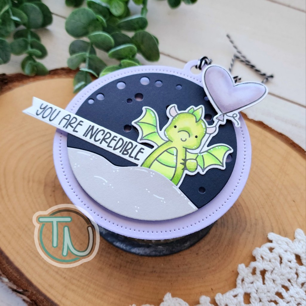 I cut the background piece from purple to match the way I colored the dragon’s balloon. Then I cut the scene elements from black and gray cardstocks. I used foam squares to add those to the purple tag and tucked the dragon into the ground piece.