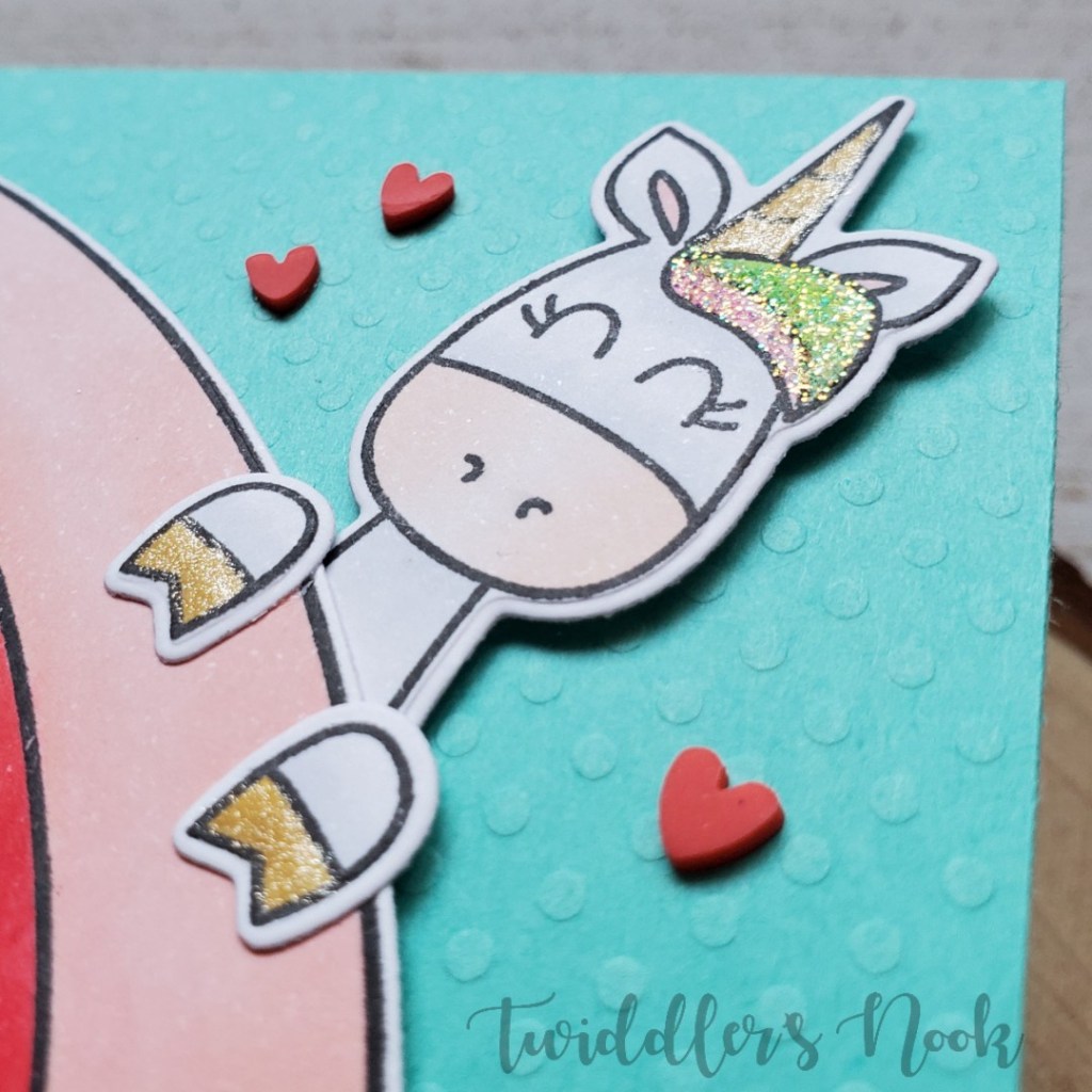 For finishing touches, I added glossy accents to the bunny’s glasses and nose, unicorn Stickles to the unicorn horn and Wink of Stella glitter brush pen to the “hair” of the unicorn. Last, I thought it would round the design out to add some Lemon Drop Dream Jelly Drop Hearts from Trinity Stamps around the sun.
