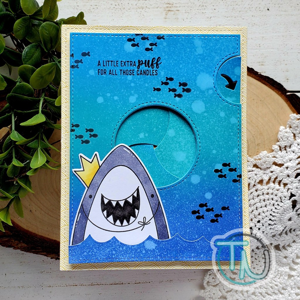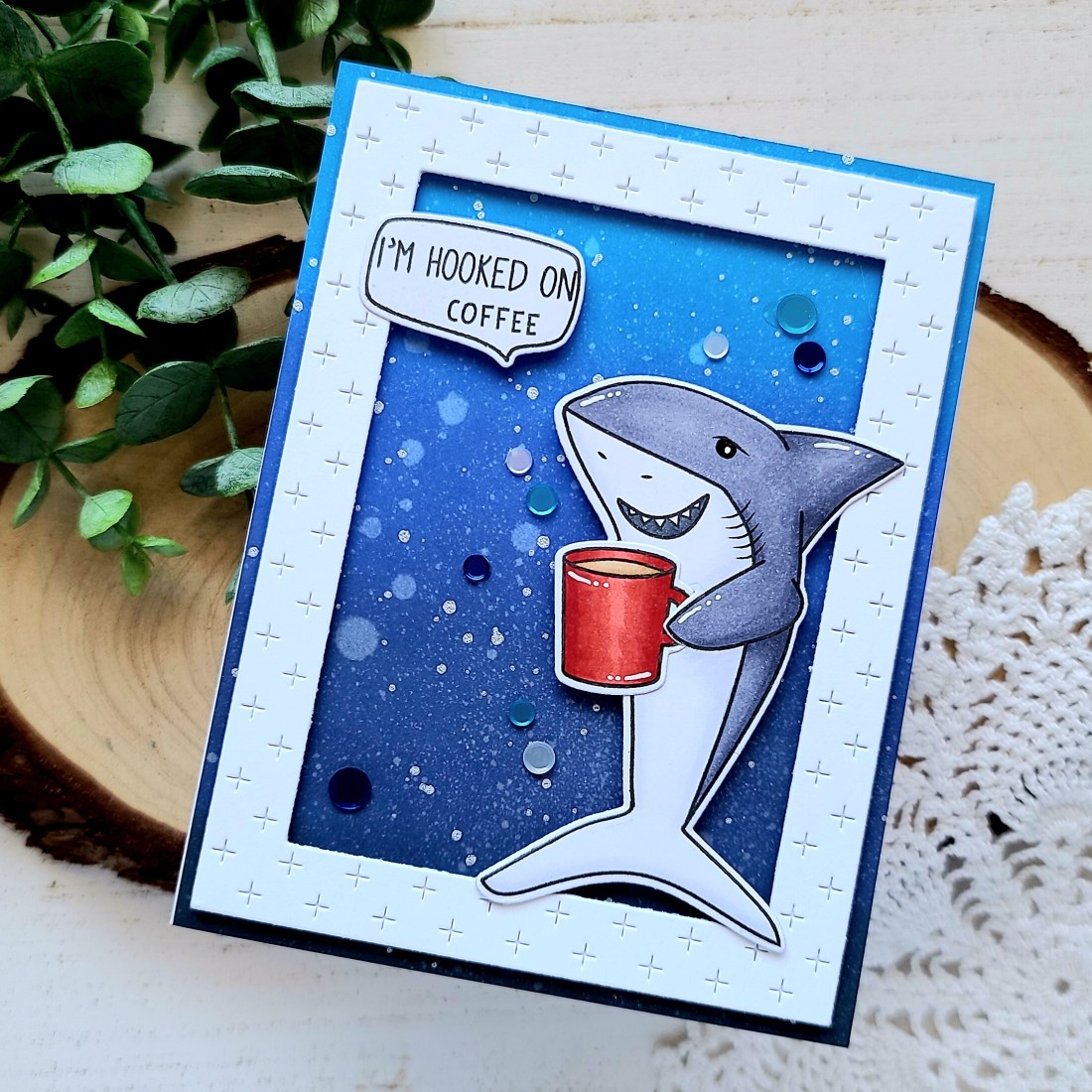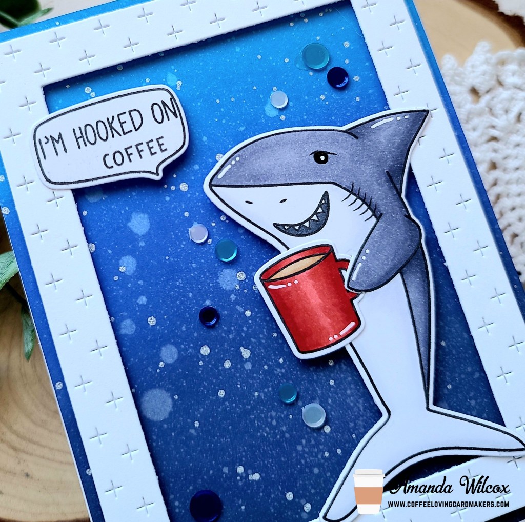 Hellooooooooo everyone!!! I’m so excited that shark week has begun! I always love this week on TV. So today, for our installment of Tuesday Tea with Twiddler’s Nook over on the Coffee Loving Cardmakers blog, I decided it would be fun to celebrate with a silly themed card.