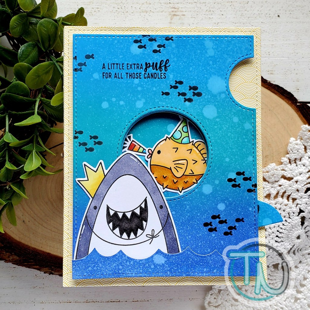 To finish off this fun card, I scattered a few confetti sequins about and adhered them with liquid glue as well. I added black glaze pen to the shark’s eye and white gel pen accents throughout.