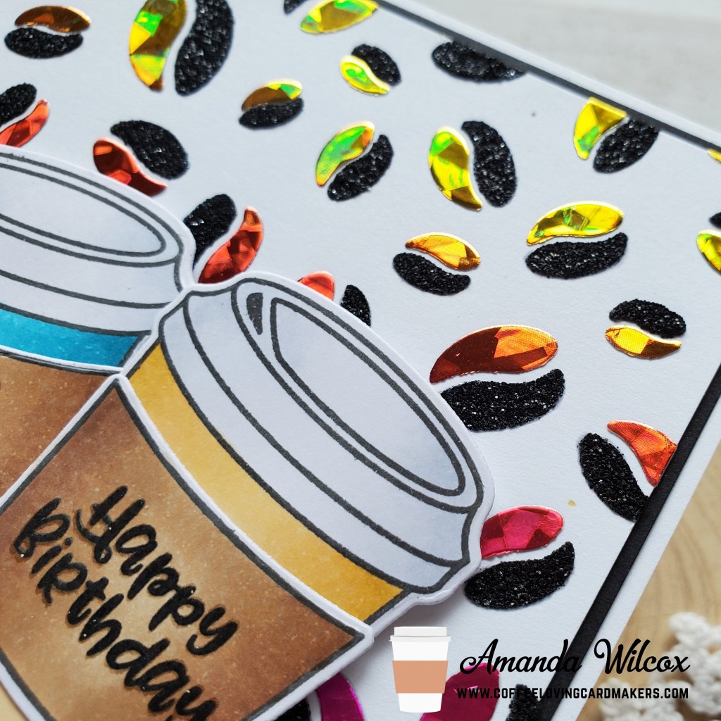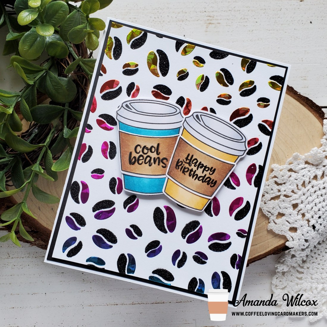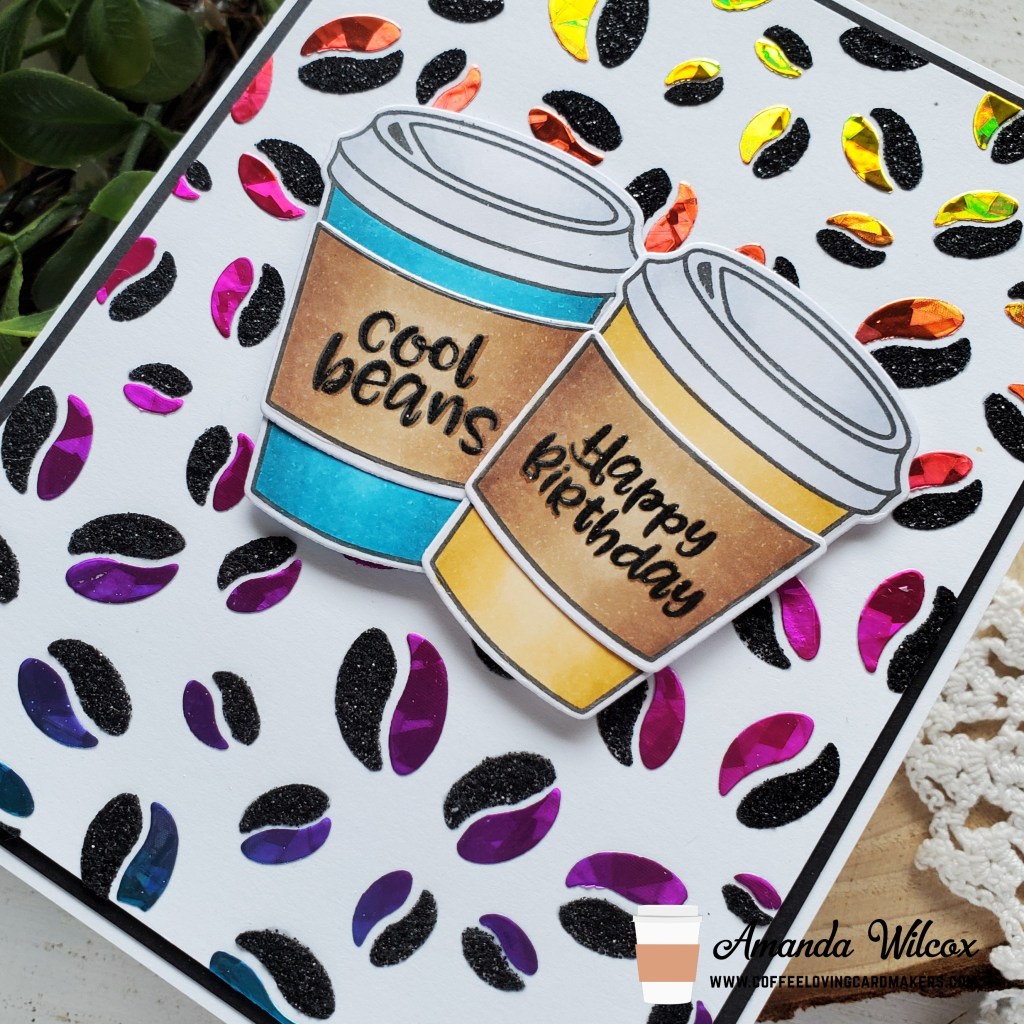 Hello everyone! I’m up on the Coffee Loving Cardmakers blog today with this awesome and crazy cool beans birthday card. I was chatting with a crafty friend this weekend and she dared me to go wild and crazy with the Trinity Stamps coffee bean stencil. So I totally accepted and this is what I came up with.