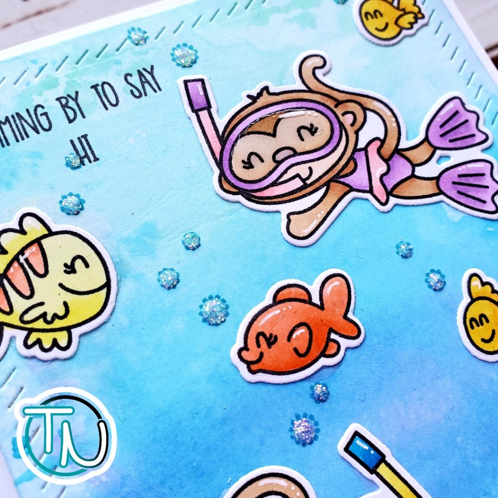 To create this card, I pulled out an old favorite technique – ink smooshing with Tombow brush markers. I did that on a panel and when it was dry die cut it with an Avery Elle panel die. Then I stamped out my images from Monkey Sea Monkey Do and colored them with my copics. I used the coordinating dies to cut everything out and started deciding on final placement.
