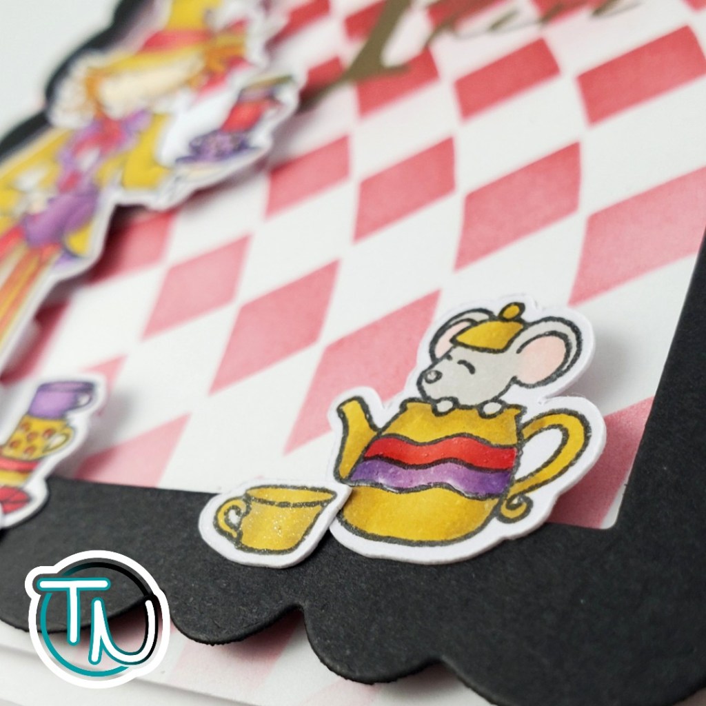 I started this card by stamping and coloring my images with copics. Then I used my scan-n-cut to cut them all out and set them aside to start on the rest of my card. I die cut an Avery Elle wonky frame in black for some contrast. Then, using that and my images as a guide, I stamped and heat embossed my sentiment from Madness in gold. I used the Wonky Checker stencil with some red ink to match the colors I used on the Hatter. This panel was trimmed to 4×5.25 and popped up on a white card base with foam tape.