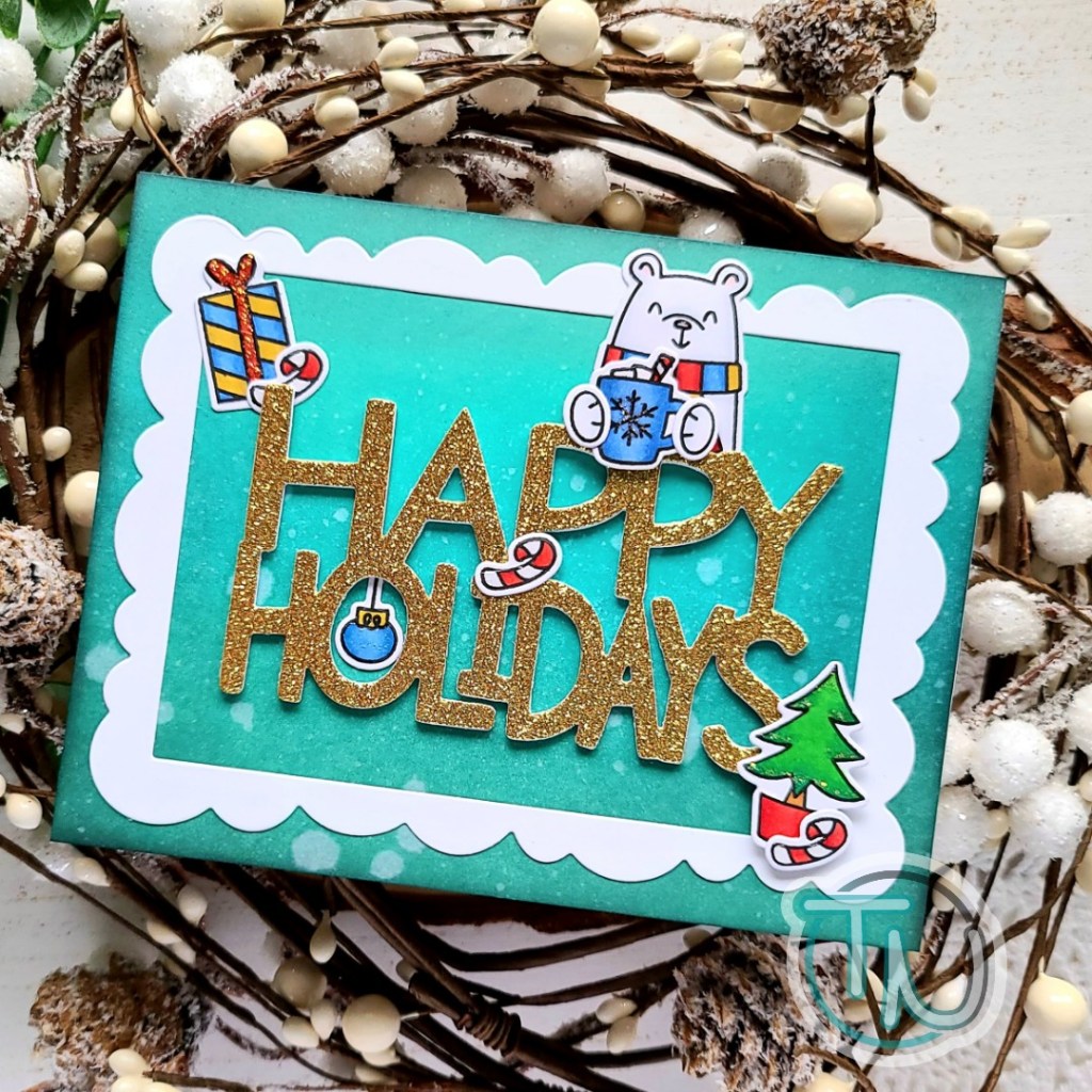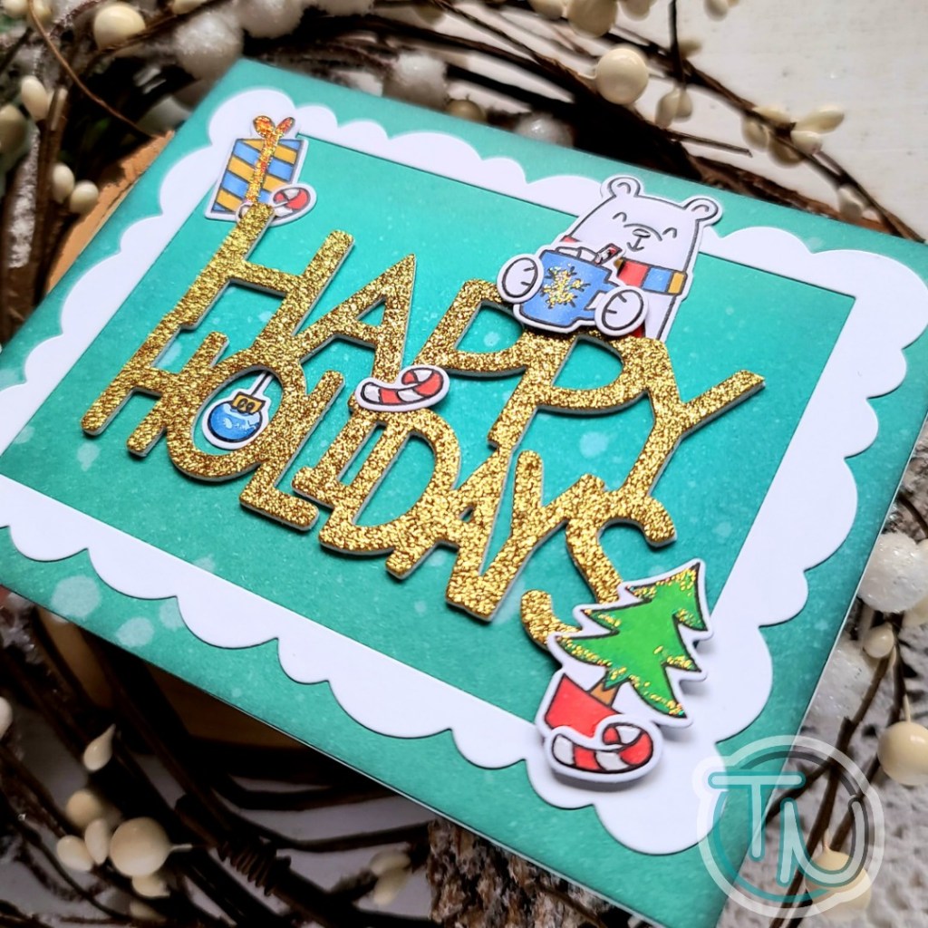 I had an idea so I started stamping and coloring my images from Avery Elle’s Cocoa Stand right away. I used the coordinating dies to cut them out and moved on to my die cut sentiment. At first I thought I would ink blend it and then I looked at my glitter cardstock and had to use that instead. There are 3 white sentiments glued together with the gold glitter glued on top.