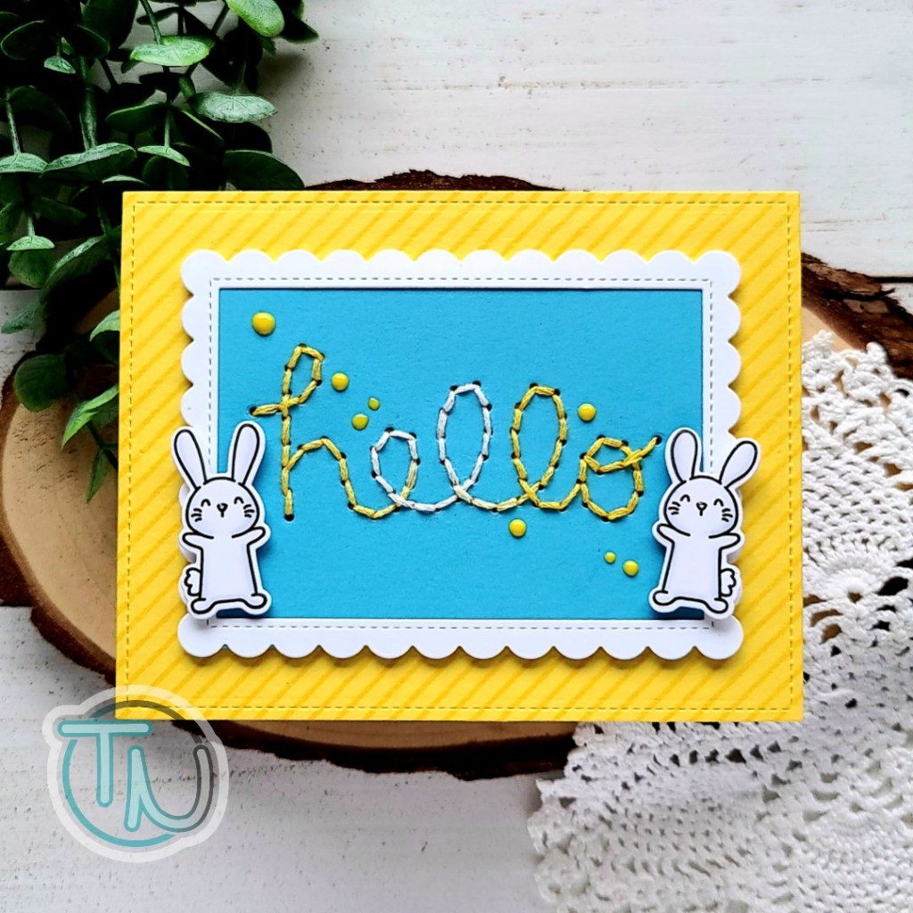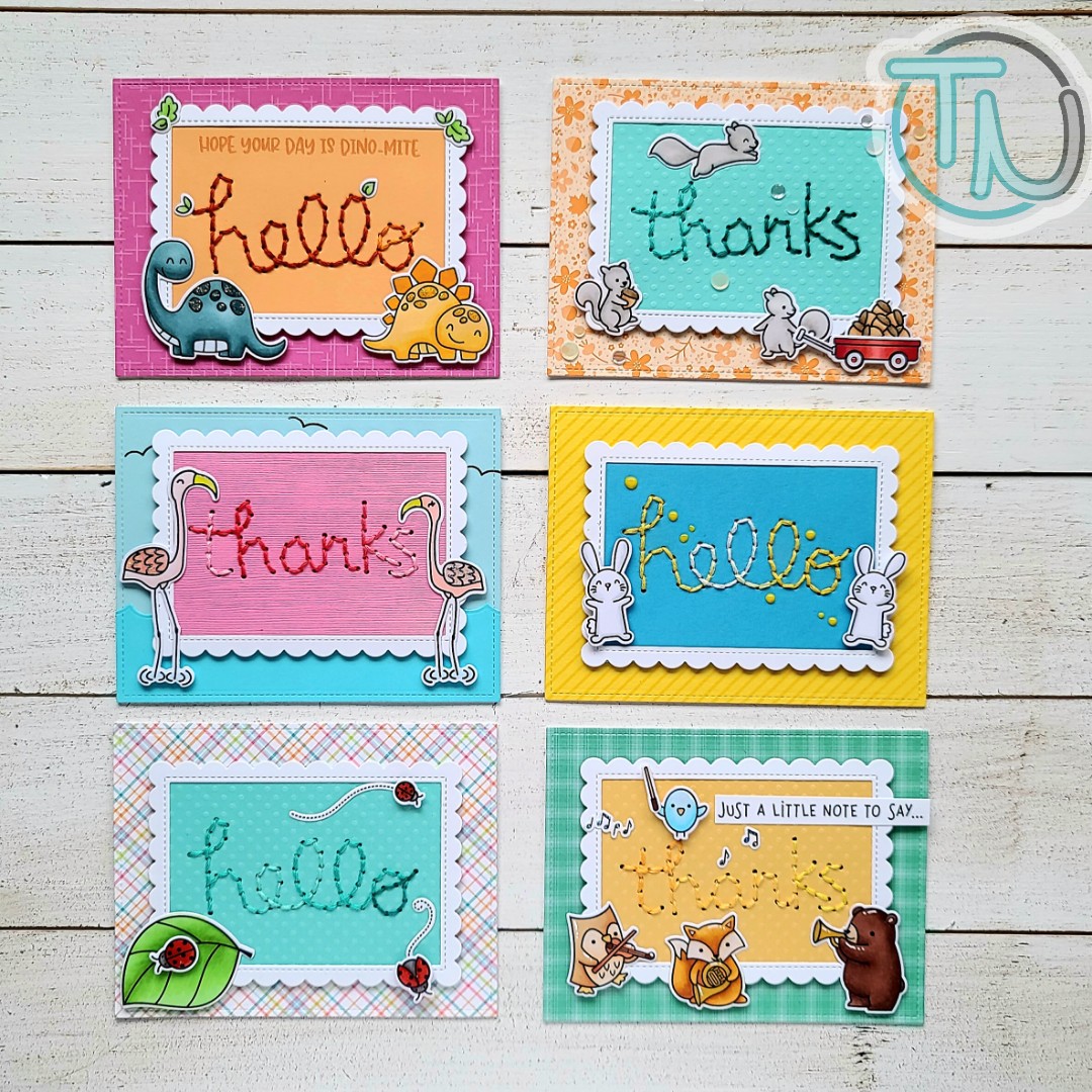 For this whole set of cards, I just chose some colors of cardstock I liked and cut them into 3×4 inch panels. I ran them through the die cut machine with the Lawn Fawn hello and thanks embroidery dies and sat in front of the TV stitching one evening. Then I die cut a Lawn Fawn scalloped rectangle frame from white cardstock 6 times and adhered the panels to them. With this part done, I dug through my stamps and paired different sets with the different stitched panels. Some I chose because of the cardstock and stitching colors and some because of the sentiment.