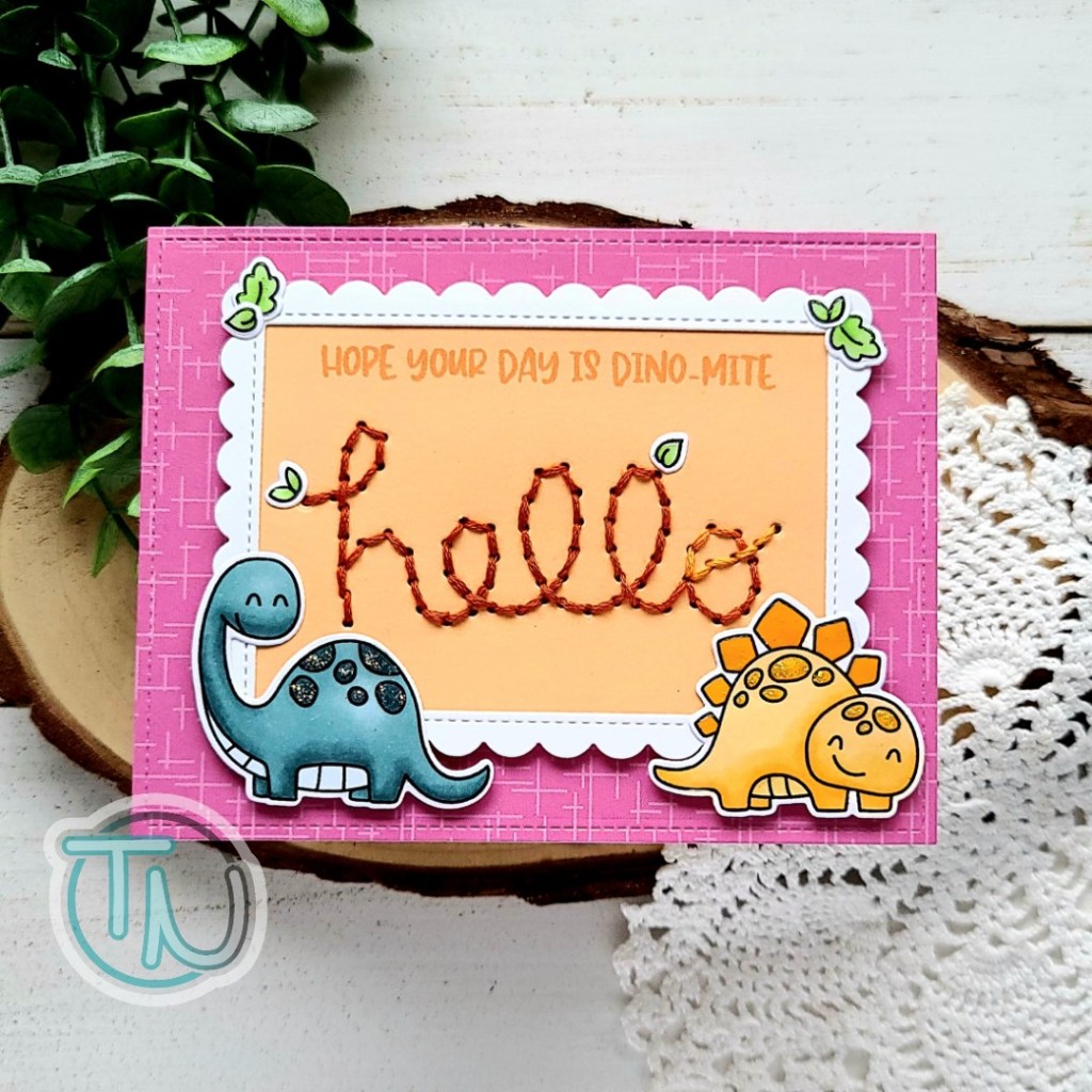 This dino one is my absolute favorite. I have a serious affliction for dinosaurs and these guys are adorable. The paper is an old Avery Elle pad I had in my stash and the stamps are also Avery Elle – Rawr.