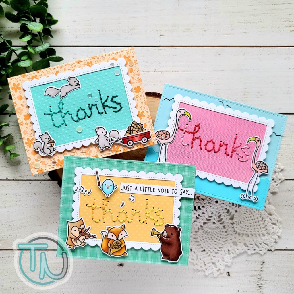 I had so much fun pulling out stamps that I haven’t used before or very often and was able to decorate these cute stitched panels. Let’s take a look at the thanks set closer too.