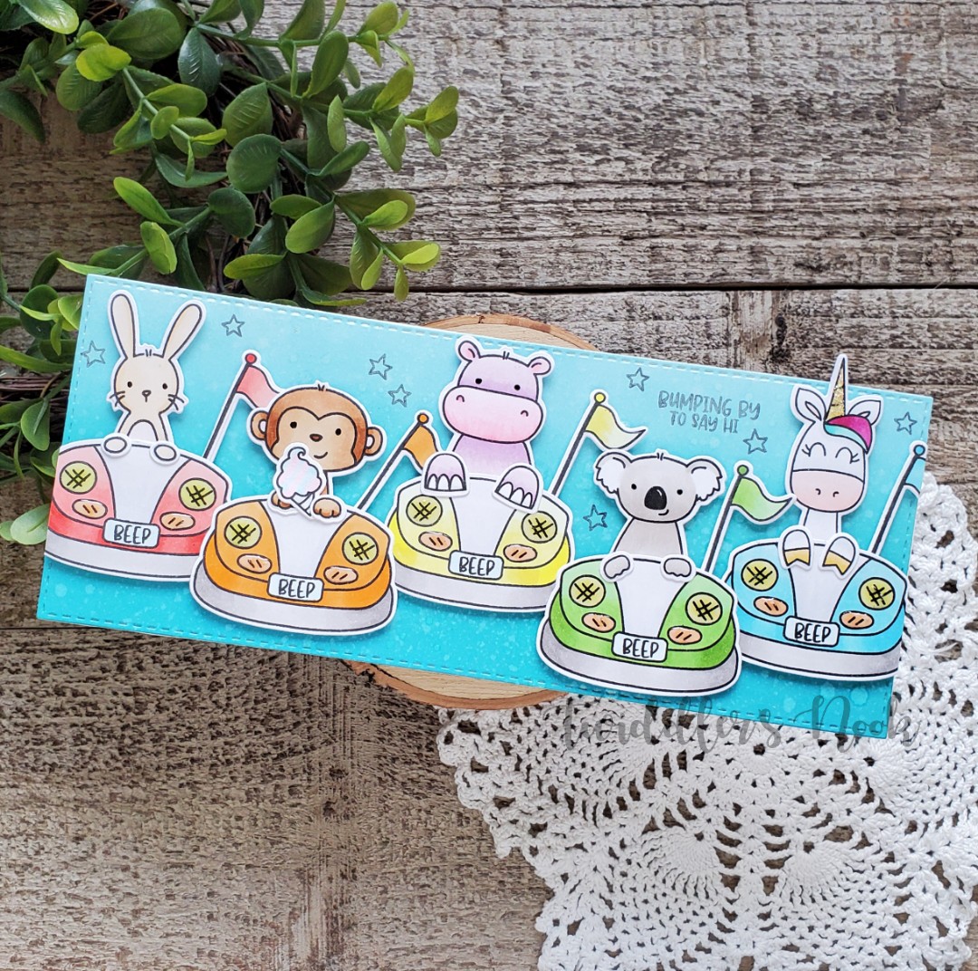 I assembled all the bumper cars with their critters and flags and popped them all up on the inked panel with foam tape. Then I stamped my sentiment along with some fun stars to fill in the open space. I really like the look this gives without taking away from the main images.
