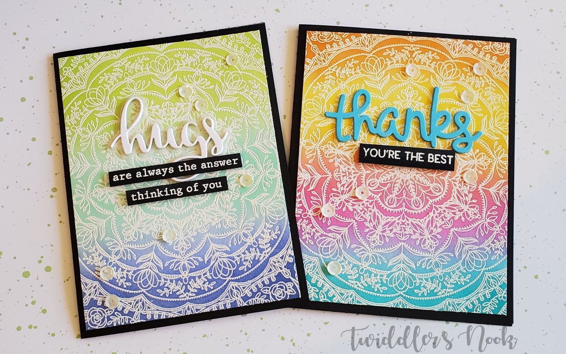 - Blended black soot distress ink on a white panel and spritzed it with water. Then flicked gold and silver watercolors all over the background for a night sky/galaxy look.