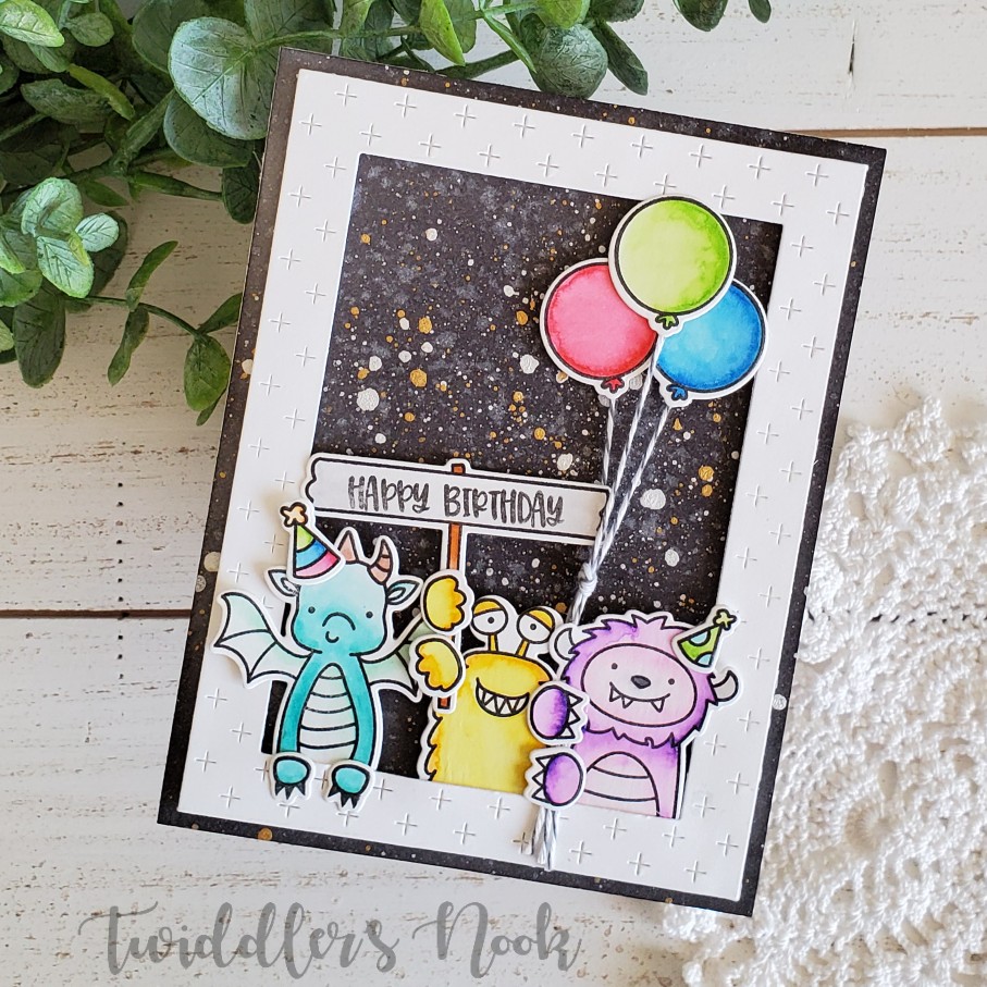 Happy Friday and thanks for stopping by! I can’t get enough of these new Scary Pals from Avery Elle! They are too fun and so versatile. Today’s card has a really fun metallic watercolor background and the monsters are watercolored with Zig Clean Color Real Brush Markers too.