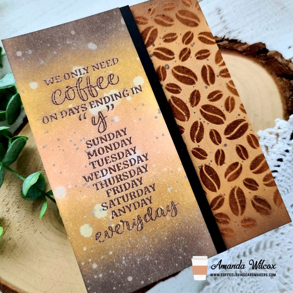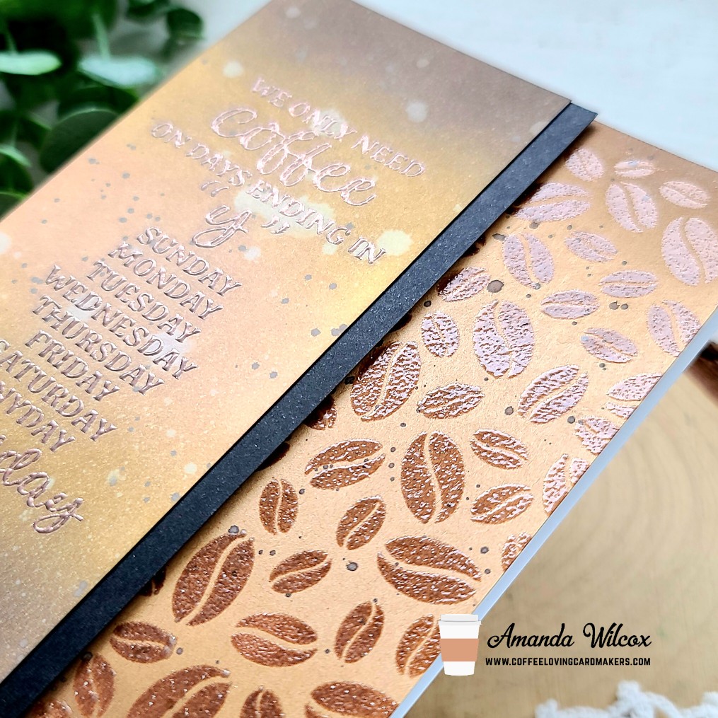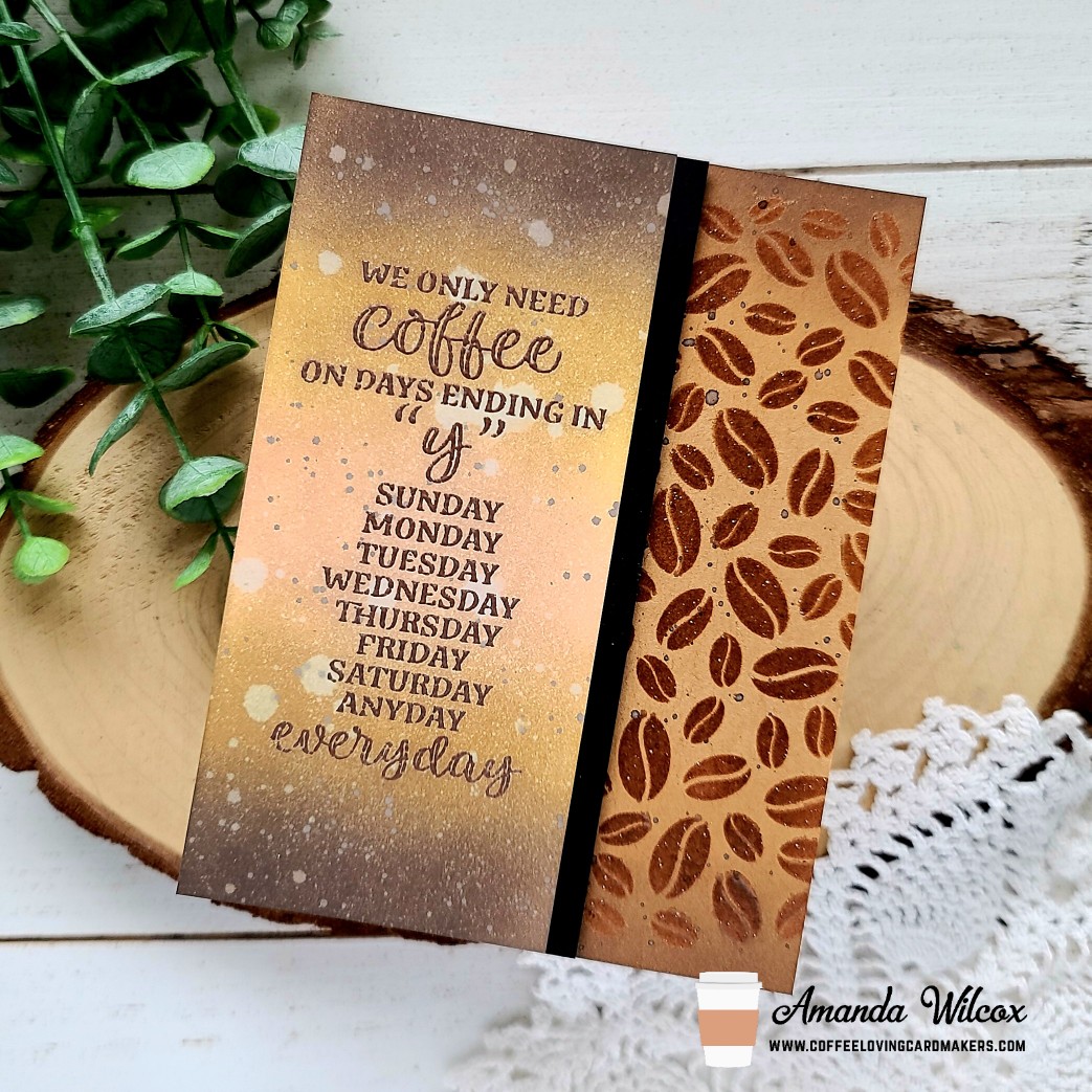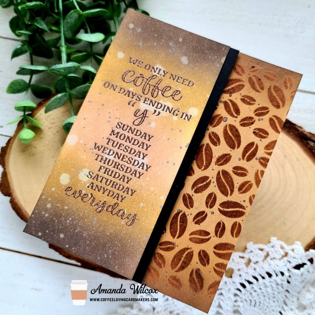 I started by cutting a strip of kraft cardstock and inked up the by the beans stencil with brown ink. Then I left my stencil in place and went over the whole thing with VersaMark ink and added clear embossing powder for cool shiny coffee beans! I took some tea dye distress ink and inked up the top and bottom of my strip for some added interest. Then I watered down ground espresso distress oxide ink and flicked it all over the panel.
