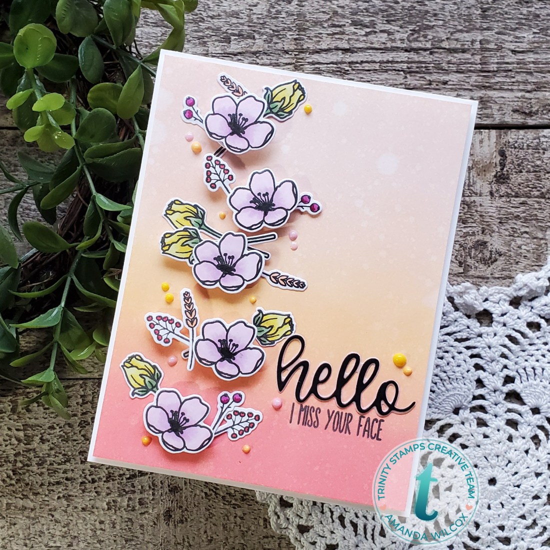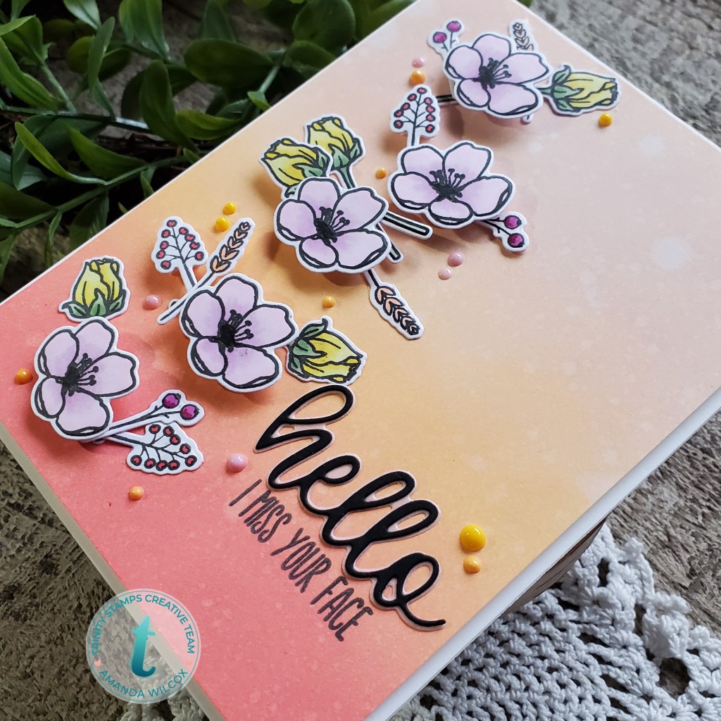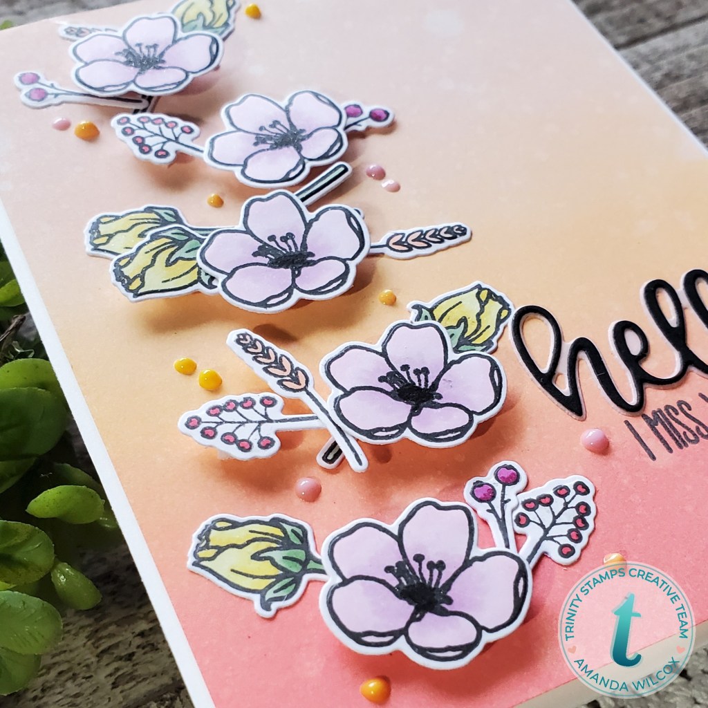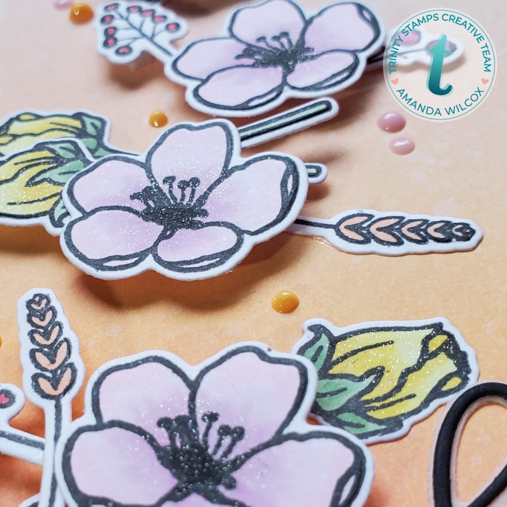 For my background, I was inspired by my friend, Candice Fisher, over at CandiCards. She’s always sharing beautiful inspiration. She used similar colors on a stenciled background last week and I loved it so much I had to try it. I don’t have the same colors she used so I chose distress oxides in abandoned coral, dried marigold and tattered rose. After blending with my Trinity Blending Buddies, I spritzed it with water and trimmed it down so I had a small white border from my cardbase.