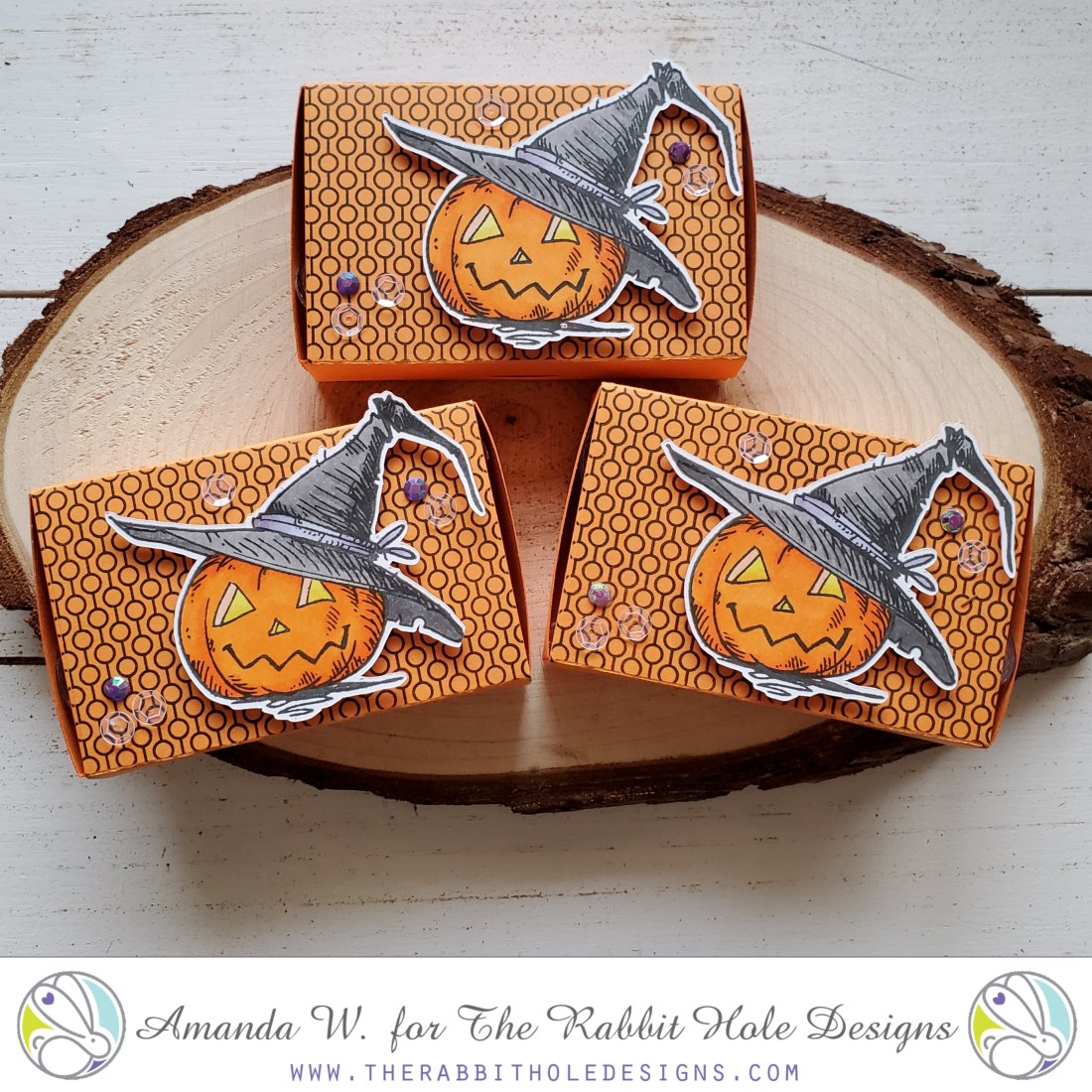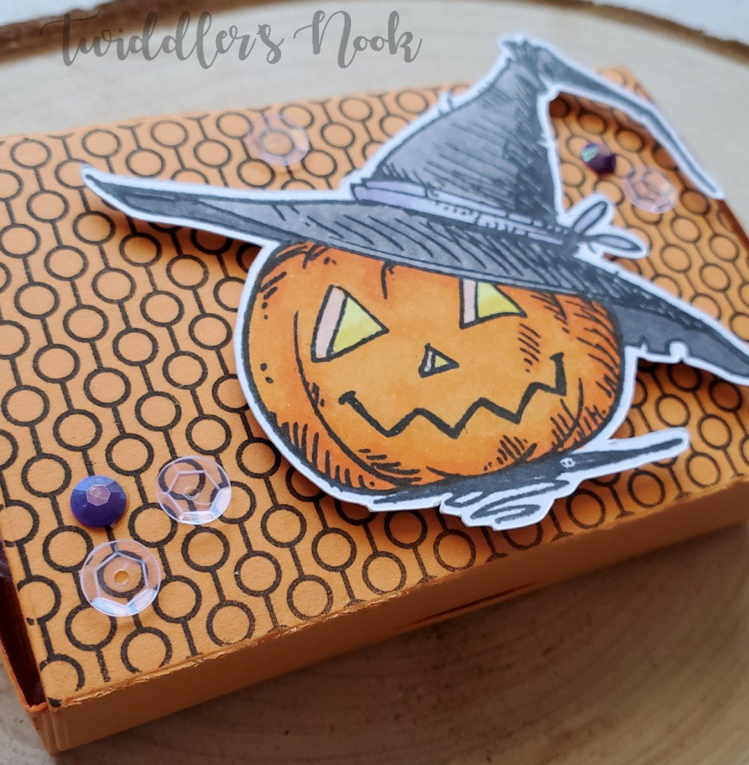 I used a background stamp on just the top portion that you see. Stamped, colored and cut out my Gourd-geous pumpkin from The Rabbit Hole Designs and then popped it up on the box top. We finished these off with clear sequins and purple gem stones and a little Wink of Stella glitter brush pen on the glowing pumpkin eyes.