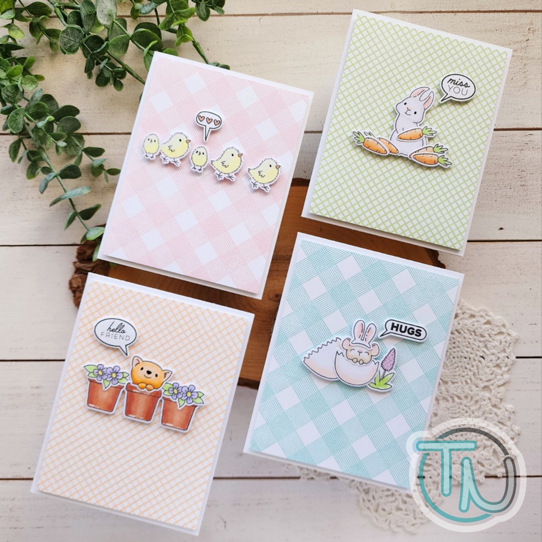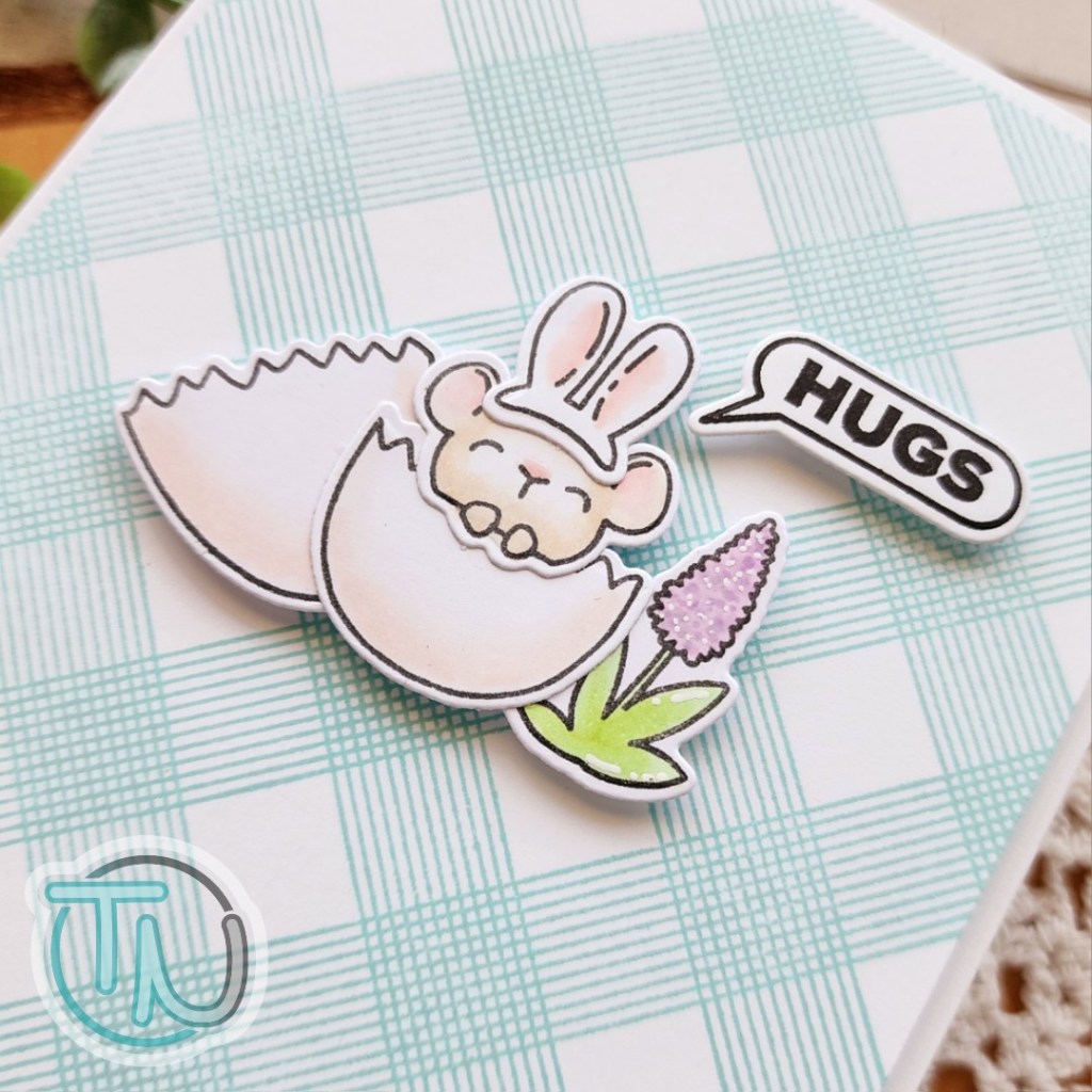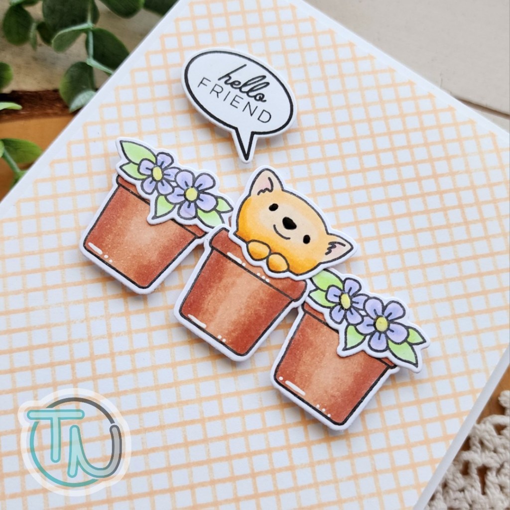 I used the same stamp and die set for my sentiment but pulled in all three colors this time. I also glued my hats down askew instead of straight. It’s more playful and I love that!