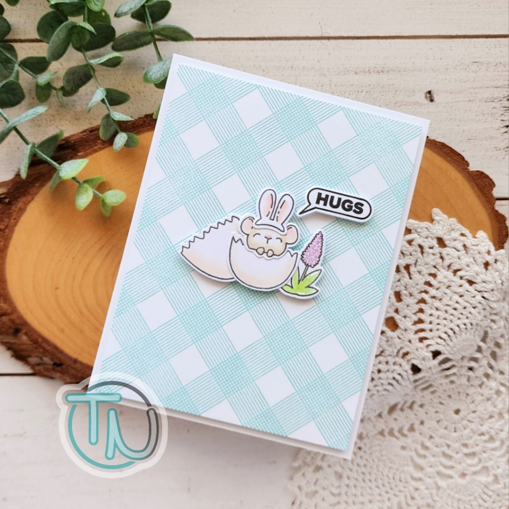 For the background I scored lines again – every inch, flipped it and did it again for a criss cross pattern. Notice that I glued this to the card front the other way so the emboss lines go in instead of popping up. Look at both sides if your paper when you emboss…they give different looks and both are great to use!