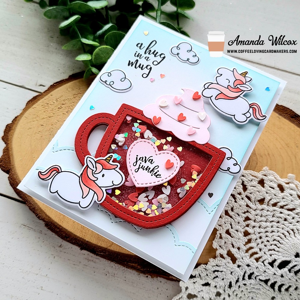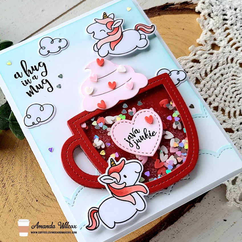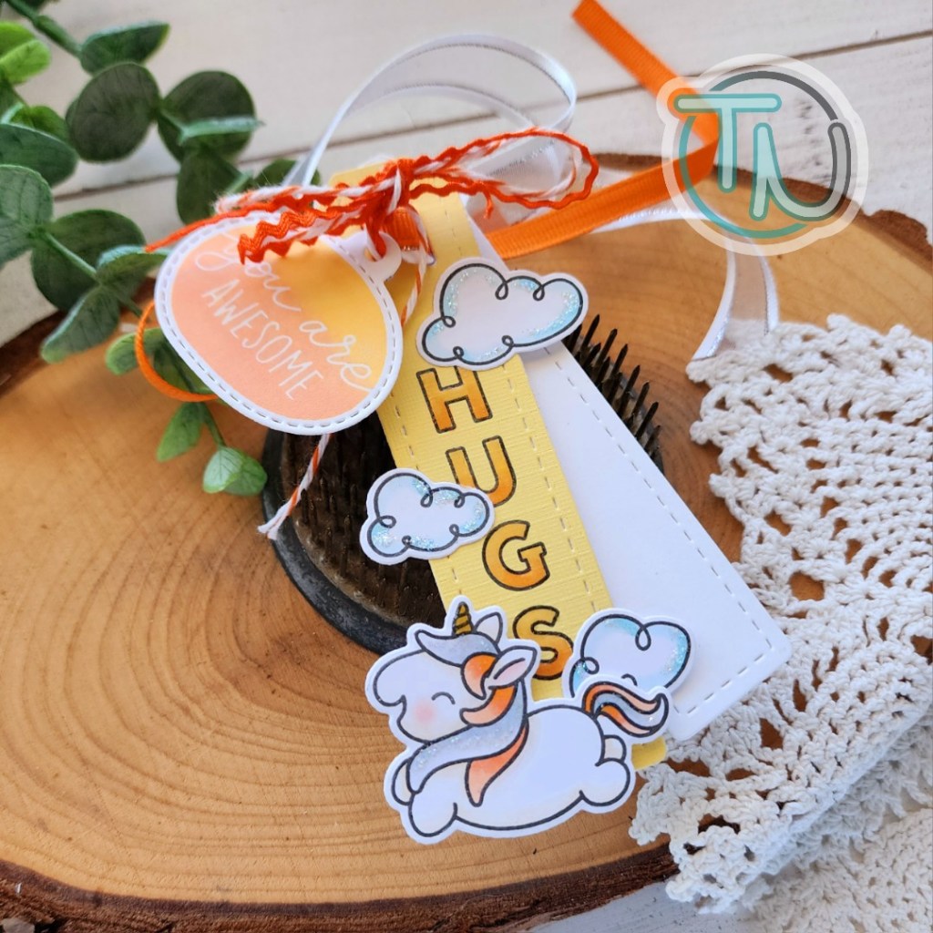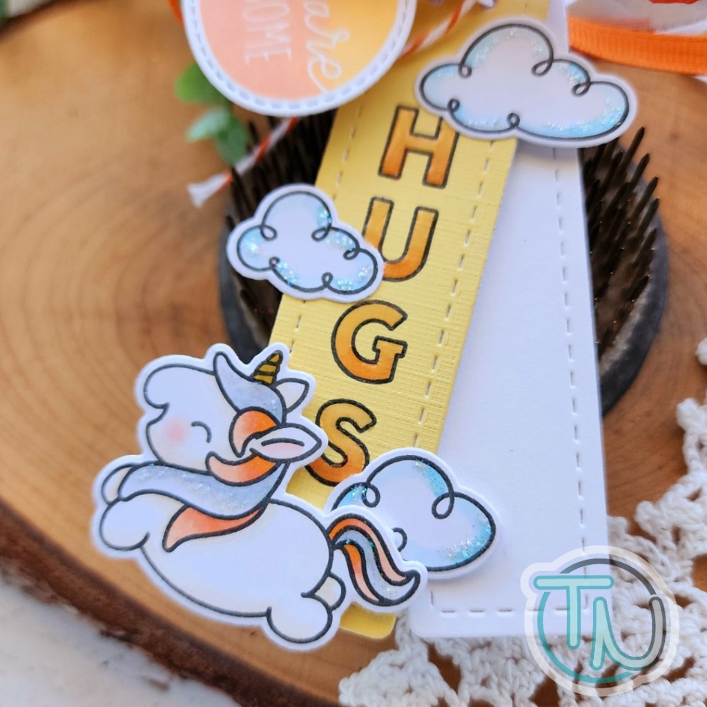 I started with stardust Stickles on the clouds and gray parts of the unicorn hair. Then I added glossy accents to the “hugs” sentiment and unicorn’s horn.