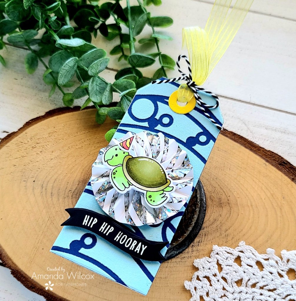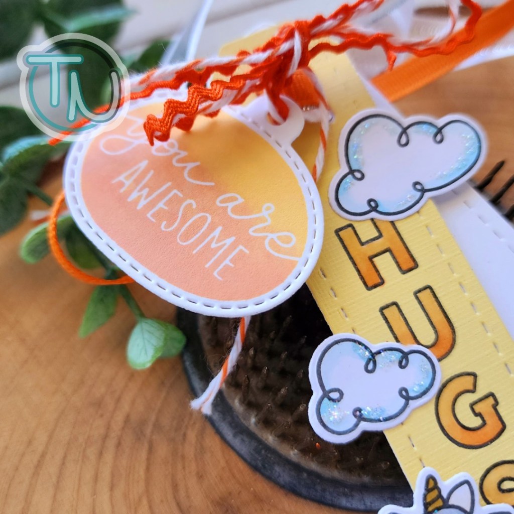 I thought the hugs sentiment was lacking so I went back for more. I love these fun Pebble Sentiment stamps but there wasn’t room on the tag to add it. When I was looking at the dies for these I remembered there is one that turns them into a tag. I thought an awesome way to incorporate more to my tag is to layer them together with fun twine and ribbon.