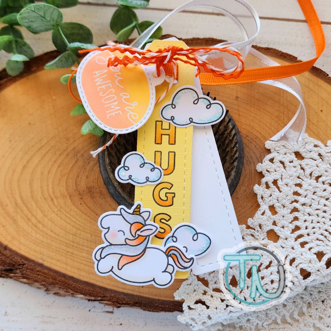 I started this project by choosing a tag shape from the Tiny Tag Trio dies. I cut one from white cardstock knowing I would use it for a backer but could use it for layout in the mean time. Then I chose a sentiment from Very Vertical Greetings stamps and eventually landed on the absolutely adorable chubby unicorn and clouds from Fluffy Puffy Unicorns.